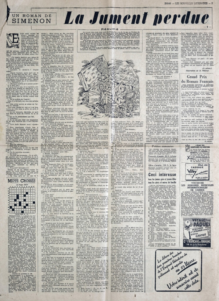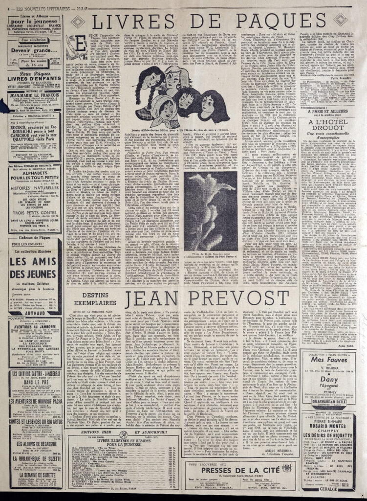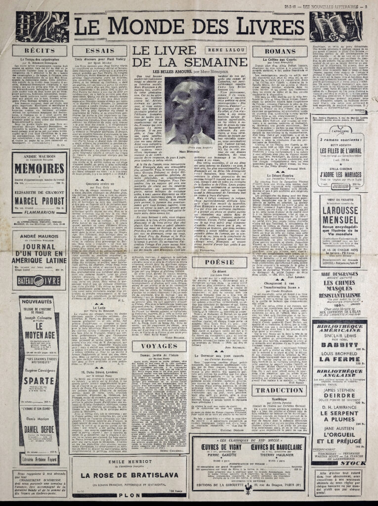 Απόκομμα, έντυπο, στα γαλλικά, χαρτί, 3 φύλλα, 6 σελίδες, όπου δημοσιεύονται άρθρα με τίτλους: Gabriel Marcel “Dommage qu’ elle soit une prostituée I-L’ impure”, Rene Lalou “Le livre de la semaine. Les Belles amours par Marc Blancpain”, “Livres de Paques”, André Maurois “Jean Prevost”, Fr. Lefevre “La poèsie du livre”, A. Bourin “A Montmartre chez Daragnès”, “Les nouvelles artistiques”.