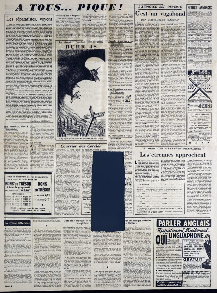 Απόκομμα, έντυπο, στα γαλλικά, χαρτί, διπλής όψης, όπου δημοσιεύεται άρθρο του συγγραφέα και δημοσιογράφου A. Chamson. Στο ίδιο απόκομμα: Raymond Cogniat “L’ art français a besoin de la Paix”, Emmanuel Roblés “Prix femina 1948”, Julien Cain “Le comité du livre français”, Pierre Bost “Vues panoramiques”, Marcel Prenant “Il faut nourrir les cerveaux”.