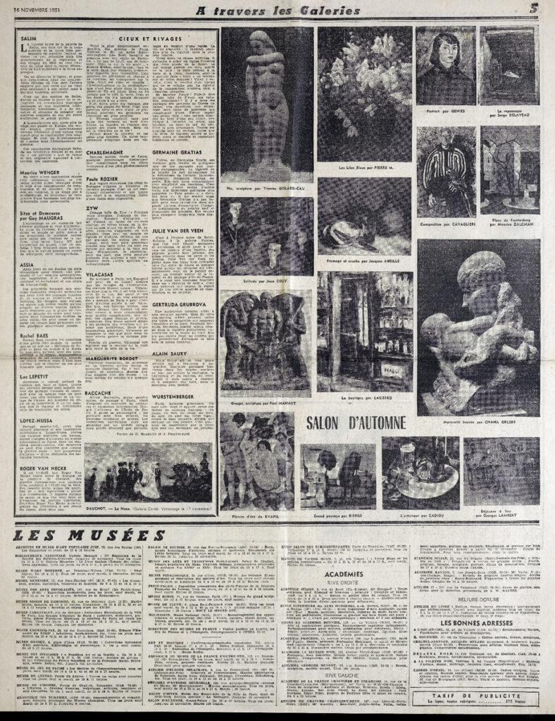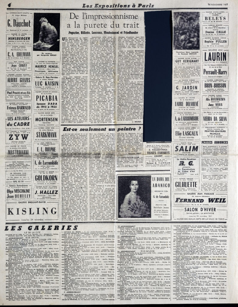 Απόκομμα του περιοδικού “Arts”, έντυπο, στα γαλλικά, χαρτί, δύο φύλλα διπλής όψης. Στο ίδιο απόκομμα: Benjamin Peret “Est-ce seulement un peintre?”, “Les Ventes publiques, “A travers les gallerie”.