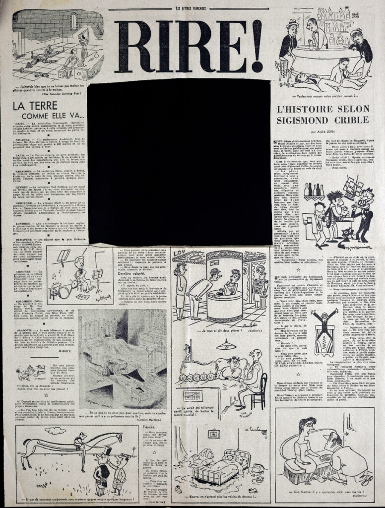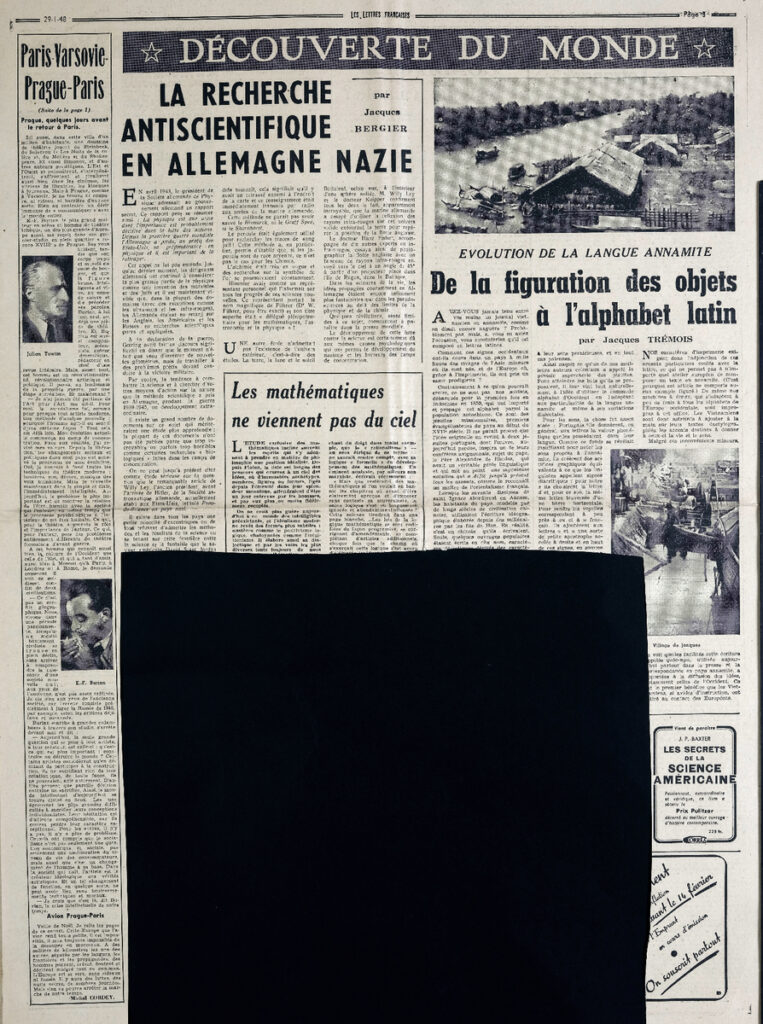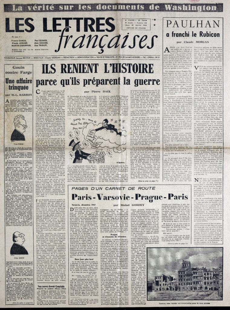 Απόκομμα, έντυπο, στα γαλλικά, χαρτί, 4 φύλλα, 8 σελίδες, όπου δημοσιεύονται άρθρα με τίτλους: Pierre Daix “Ils renient l’ histoire parce qu’ ils préparent la guerre”, Claude Morgan “Paulhan a franchi le Rubicon”, Pierre Kaldor “Rousseau et nous”, Louis Parrot “Pièges et impasses”, Melpo Axioti “De nos jours en Grèce”.