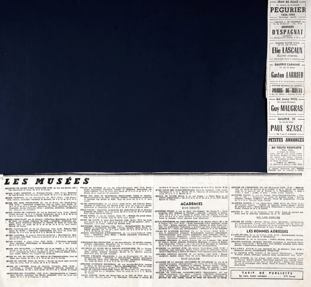 Απόκομμα, έντυπο, στα γαλλικά, χαρτί, διπλής όψης, όπου δημοσιεύεται πρόγραμμα εκθέσεων στα μουσεία.