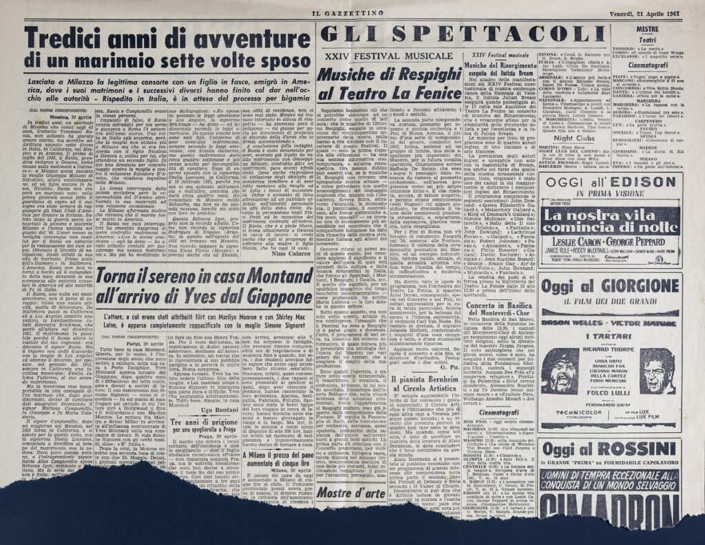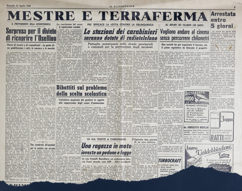 Απόκομμα της εφημερίδας “Il Gazzettino”, έντυπο, στα ιταλικά, χαρτί, δύο τμήματα διπλής όψης, 35×42 εκ., όπου δημοσιεύεται άρθρο του Tito Cortese. Το τεκμήριο εικονογραφείται. Στο ίδιο απόκομμα: “Mestre e terraferma”