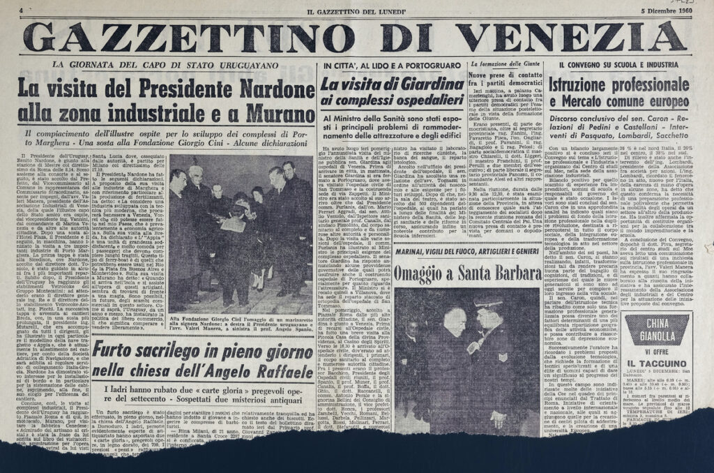Απόκομμα της εφημερίδας “Il Gazzettino”, έντυπο, στα ιταλικά, χαρτί, πέντε τμήματα διπλής όψης, 30×42 εκ. Το τεκμήριο εικονογραφείται. Στο ίδιο απόκομμα: “La visita di Giardina ai ciomplessi ospedalieri”, “Istruzione professionale e Mercvato comune europeo”, “Ultime notizie della notte”.