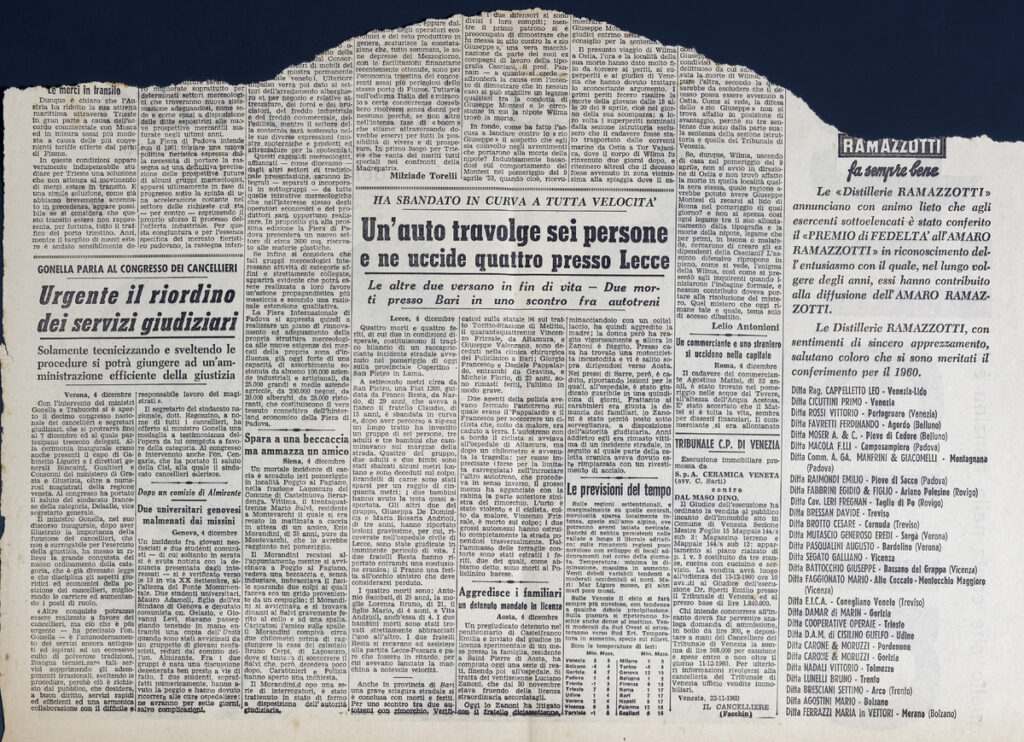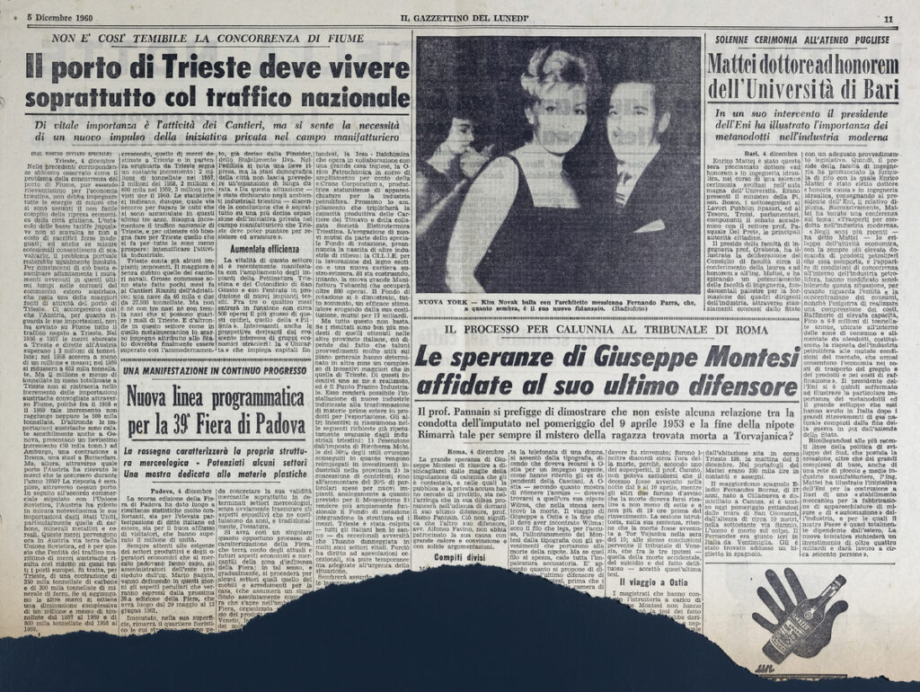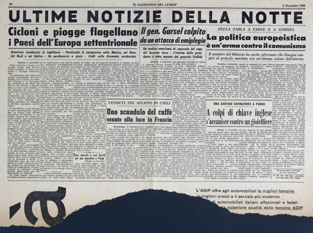 Απόκομμα της εφημερίδας “Il Gazzettino”, έντυπο, στα ιταλικά, χαρτί, πέντε τμήματα διπλής όψης, 30×42 εκ. Το τεκμήριο εικονογραφείται. Στο ίδιο απόκομμα: “La visita di Giardina ai ciomplessi ospedalieri”, “Istruzione professionale e Mercvato comune europeo”, “Ultime notizie della notte”.