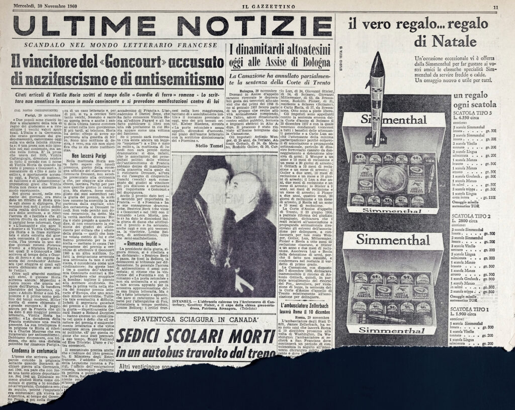 Απόκομμα της εφημερίδας “Il Gazzettino”, έντυπο, στα ιταλικά, χαρτί, διπλής όψης, 29,5×43 εκ., όπου δημοσιεύεται άρθρο του Stelio Tomei. Το τεκμήριο εικονογραφείται.
