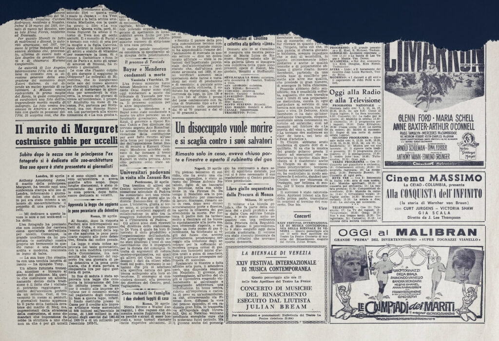 Απόκομμα, έντυπο, στα ιταλικά, χαρτί, διπλής όψης, 29,5×42 εκ., όπου δημοσιεύεται ανακοίνωση για το 14ο διεθνές φεστιβάλ σύγχρονης μουσικής. Το τεκμήριο εικονογραφείται.