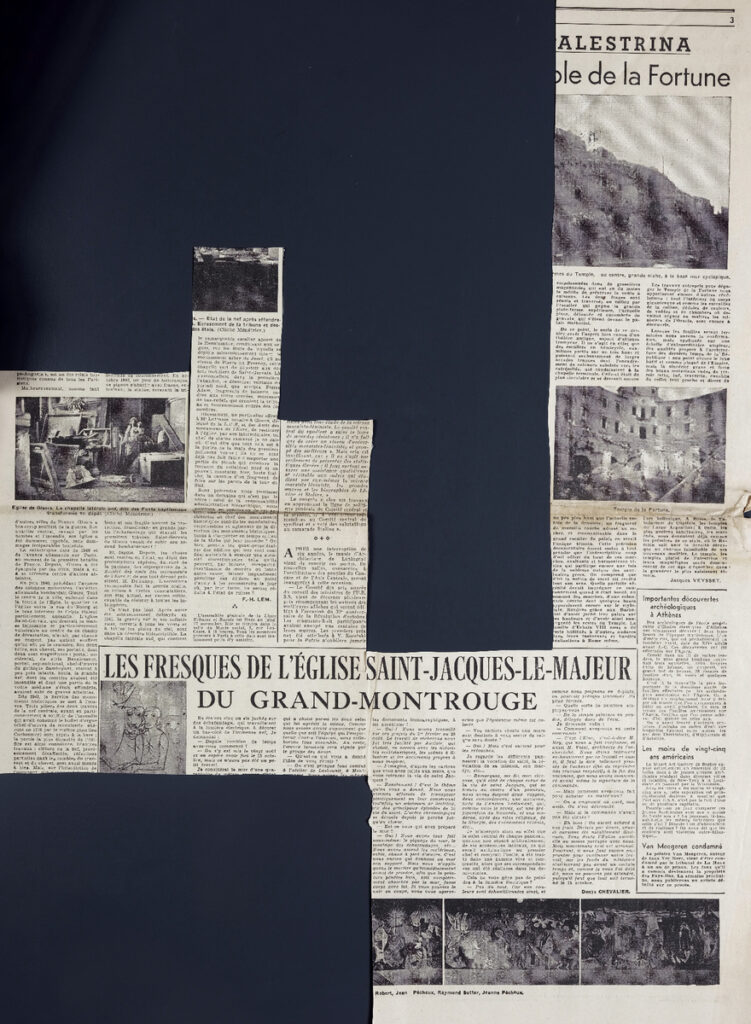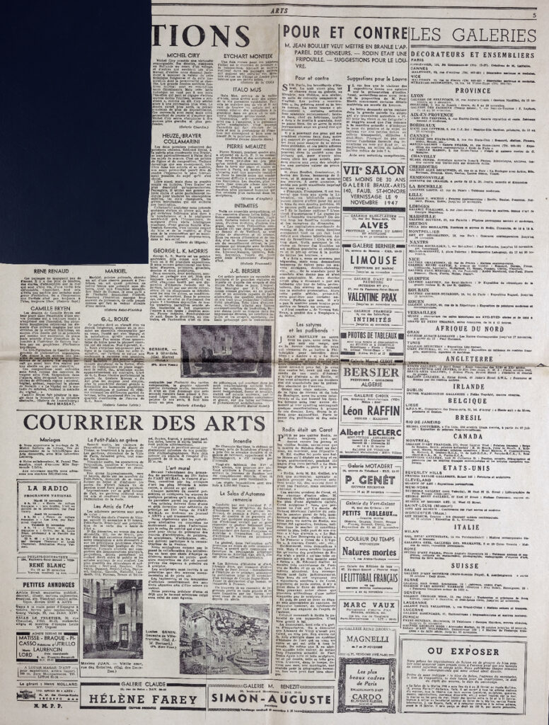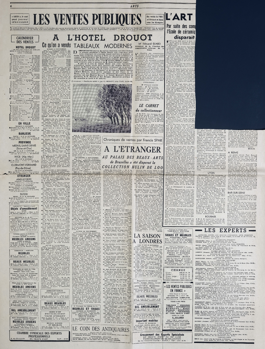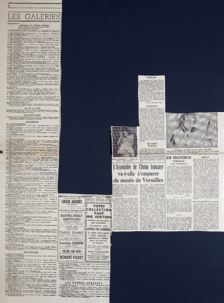 Απόκομμα του περιοδικού “Arts”, έντυπο, στα γαλλικά, χαρτί, δίφυλλο διπλής όψης, 59×44 εκ. Στο ίδιο απόκομμα: “L’ Assembée de l’ Union française va-t-elle s’ emparer du musée de Versailles, Courrier des Arts”.