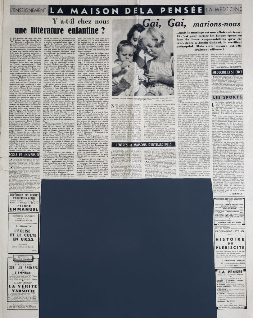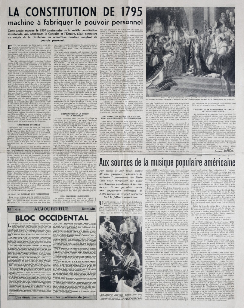 Έντυπο, στα γαλλικά, χαρτί, 3 φύλλα, 6 σελίδες, όπου δημοσιεύονται άρθρα με τίτλους: Julien Huxley “Hasard ou anti-hasard?”, Tristan Bernard “Le siècle était loin de sa deuxième année”, Jacques Angelot “La constitution de 1795 machine à fabriquer le pouvoir personnel”. Το τεκμήριο εικονογραφείται.