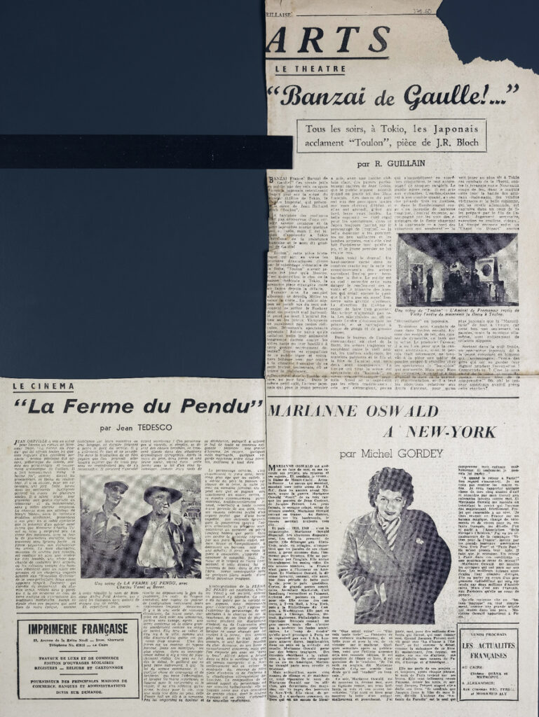 Απόκομμα της εφημερίδας “La Marseillaise”, έντυπο, στα γαλλκά, χαρτί, διπλής όψης, όπου δημοσιεύεται άρθρο του R. Guillain. Το τεκμήριο εικονογραφείται. Στο ίδιο απόκομμα: Michel Gordey “Marianne Oswald à New-York”.