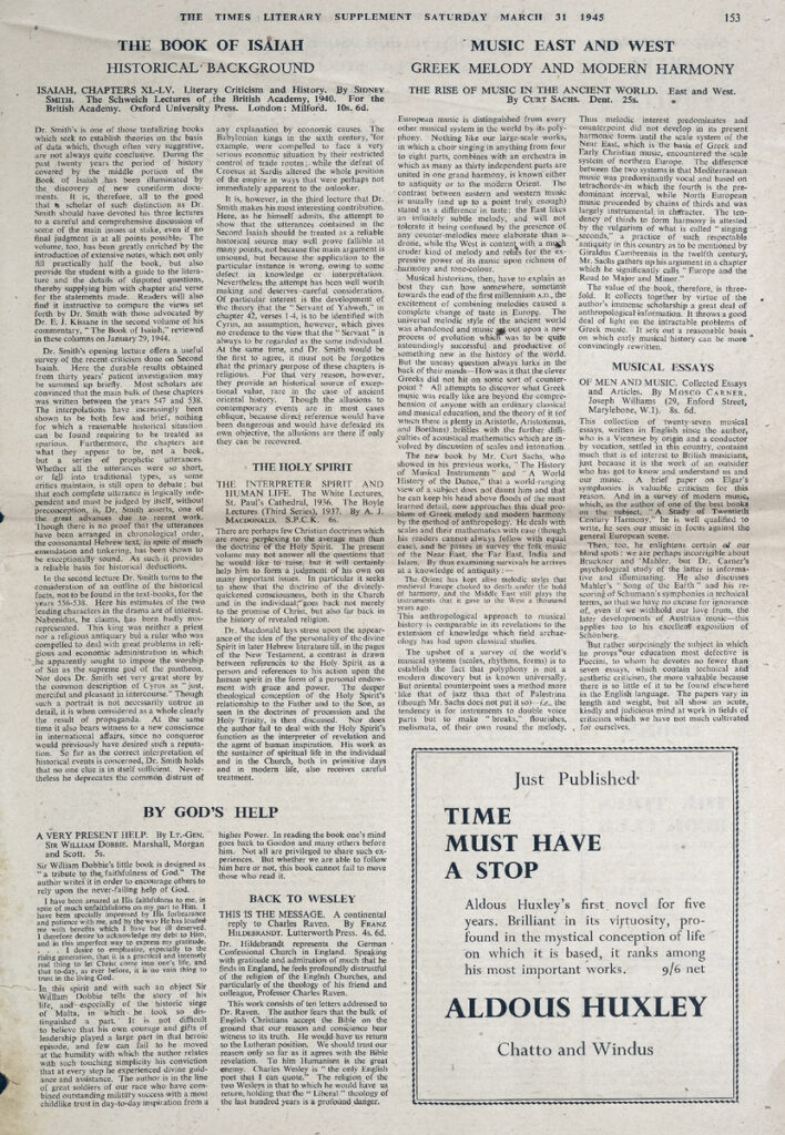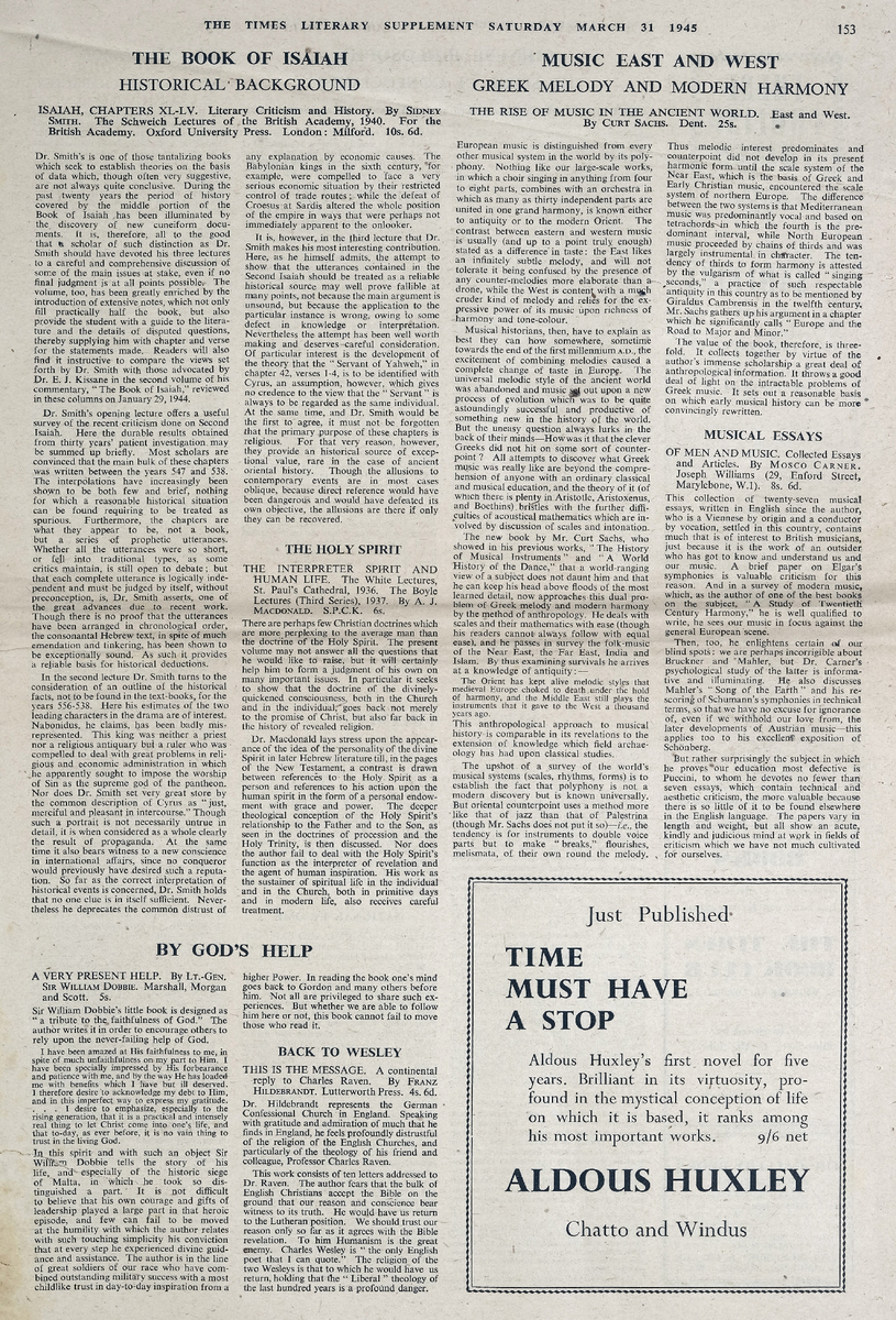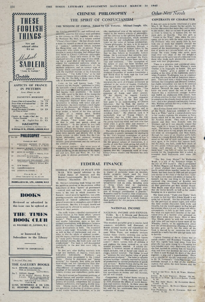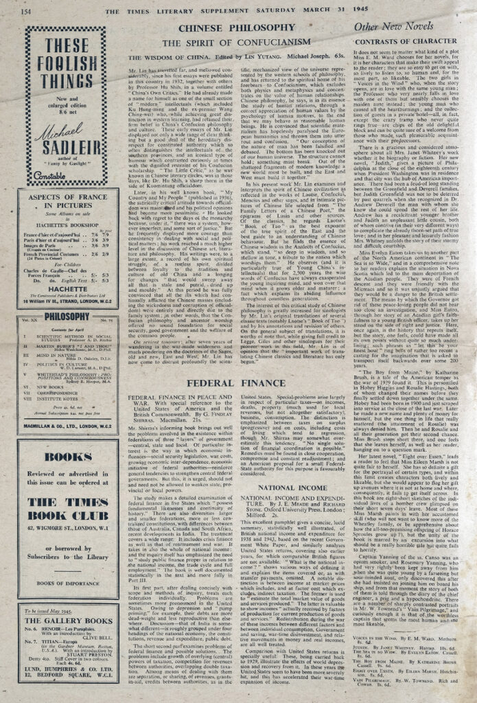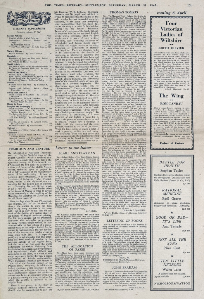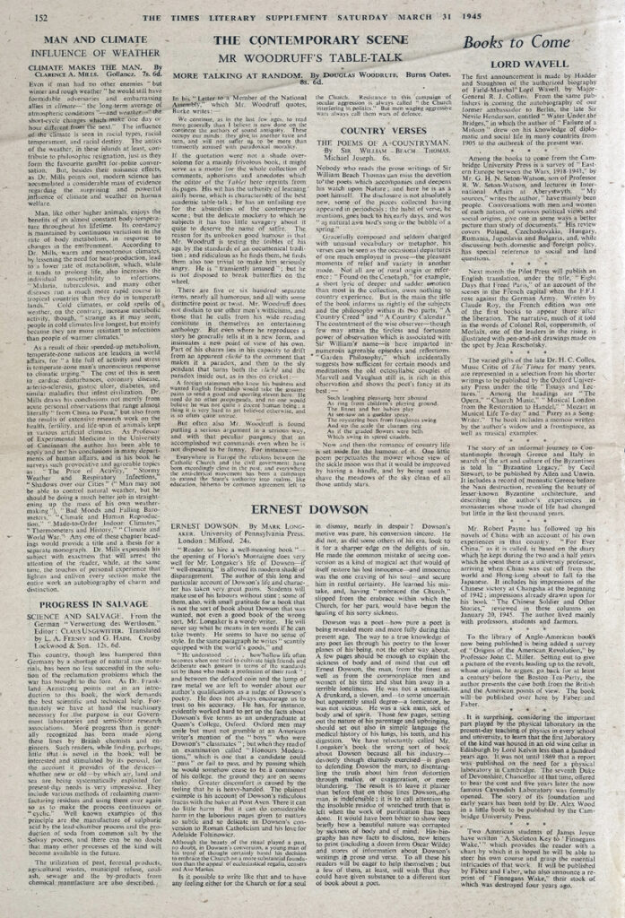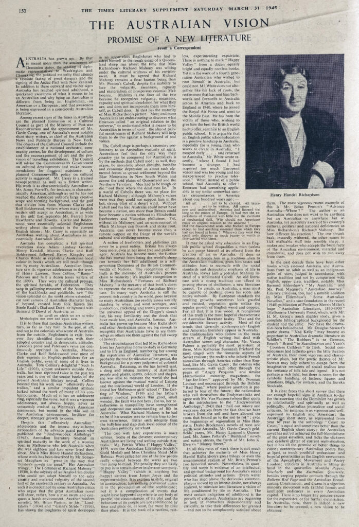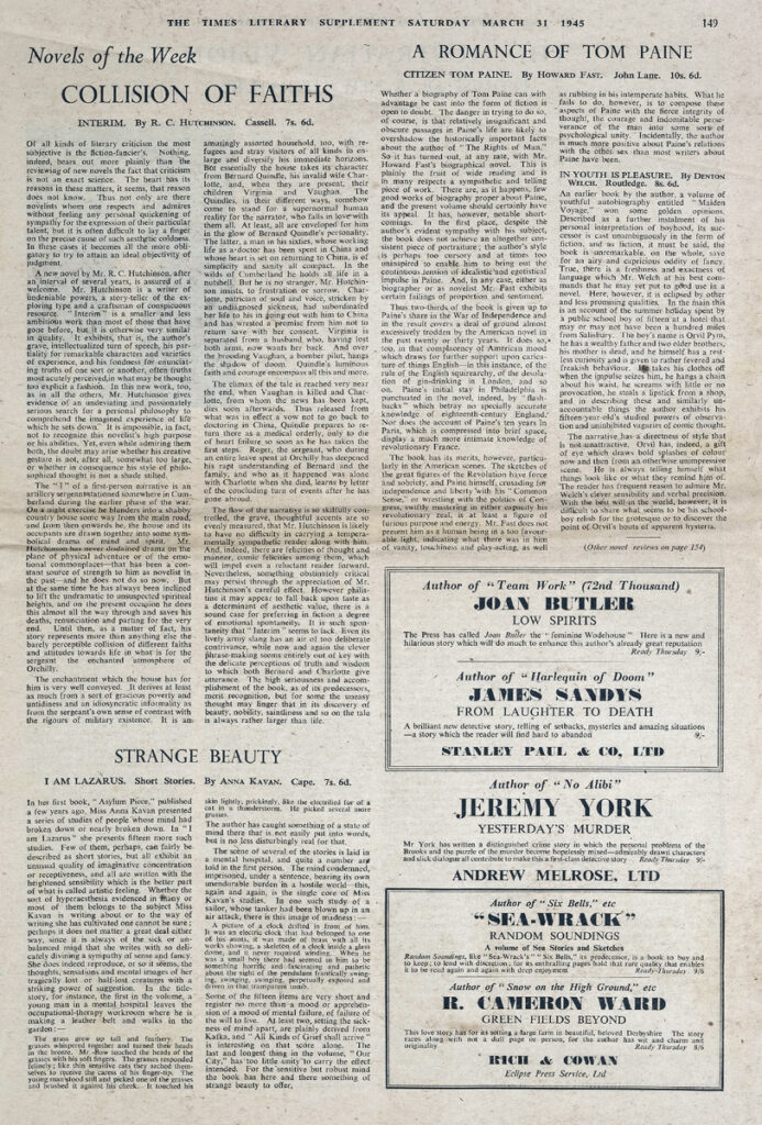 Απόκομμα της εφημερίδας “The Times”, ένθετο “The Times Literary Supplement”, έντυπο, στα αγγλικά, χαρτί, τέσσερα φύλλα διπλής όψης. Στο ίδιο απόκομμα: “Lives of great men”, “The old familiar faces”, “Securing Peace”, R. C. Hutchinson “Collision of faiths”, Howard Fast “A romance of Tom Paine”, Anna Kavan “Strange Beauty”, “The Australian vision promise of a new literature”.
