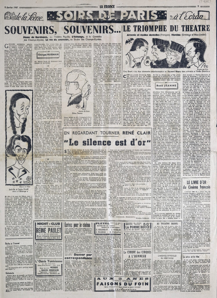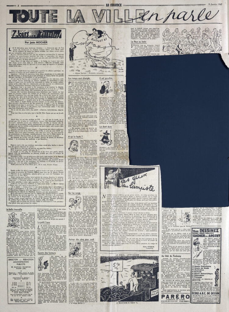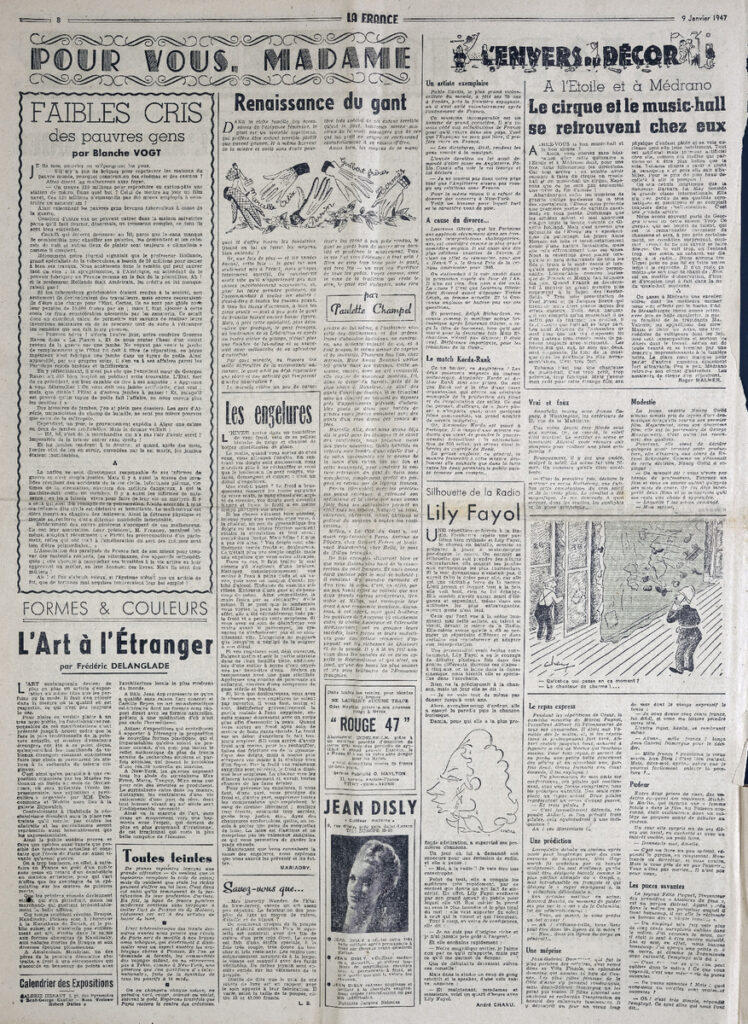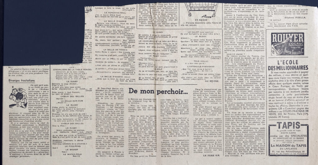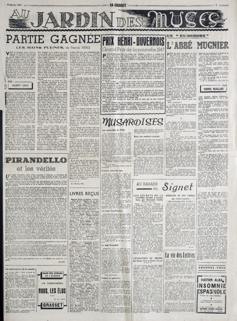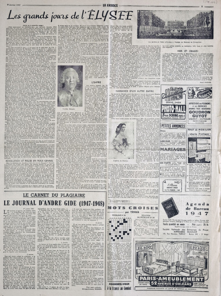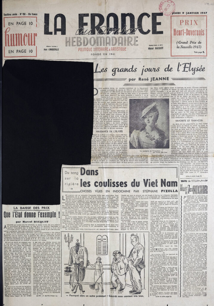 Έντυπο, στα γαλλικά, χαρτί, 5 φύλλα, 10 σελίδες, όπου δημοσιεύονται άρθρα με τίτλους: René Jeanne “Les grands jours de l’ Élysée”, Marcel Bacquet “Que l’ Etat donne l’ exemple!”, Stéphane Pizella “Dans les coulisses du Viet Nam”, Georges Armand Masson “Le journal d’ André Gide”, Albert-Jean “Partie Gagnée”, Cleon “Pirandello et les vérités”, Frédéric Delanglade “L’ art ? l’ étranger”, Paulette Champel “Renaissance du gant”.