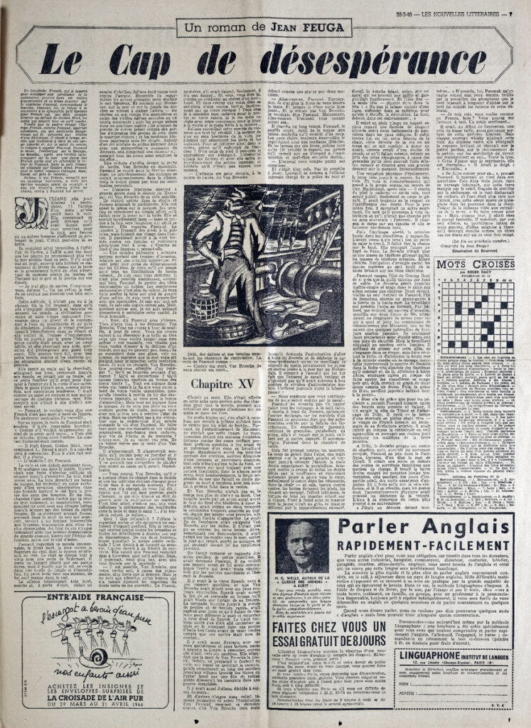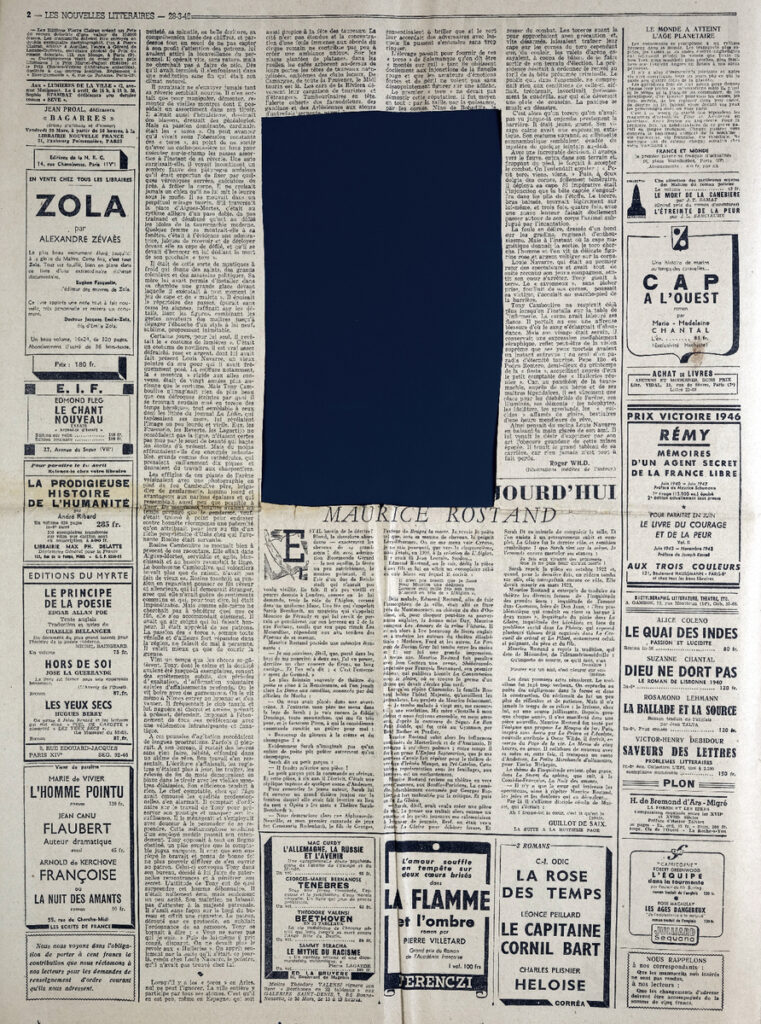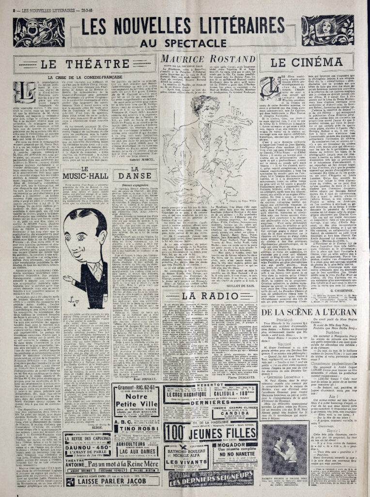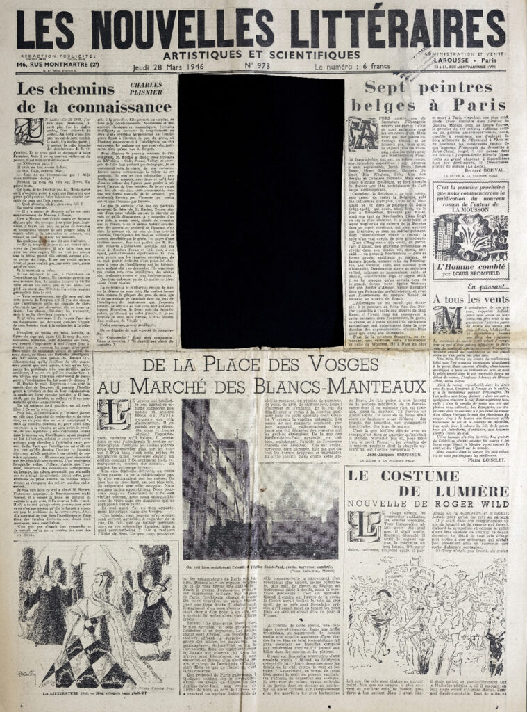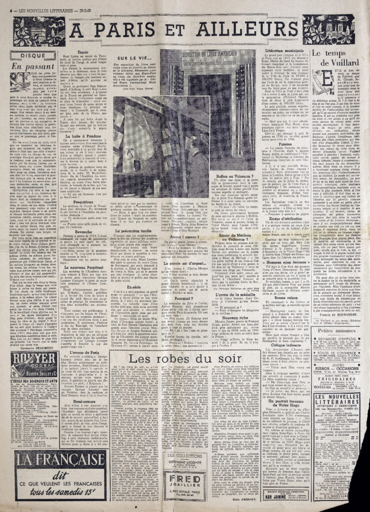 Απόκομμα, έντυπο, στα γαλλικά, χαρτί, 3 φύλλα, 6 σελίδες, όπου δημοσιεύονται άρθρα με τίτλους: Charles Plissnier “Les chemins de la connaissance”, Bernard Dorival “Sept peintres belges à Paris”, J. J. Brouson “De la place des Vosges au marché des Blancs-Manteux”, “Le monde des livres”, Gabriel Marcel “Le théâtre. La crise de la Comédie Française”, Guillot de Saix “Maurice Rostand”, G. Charensol “Le cinéma”.