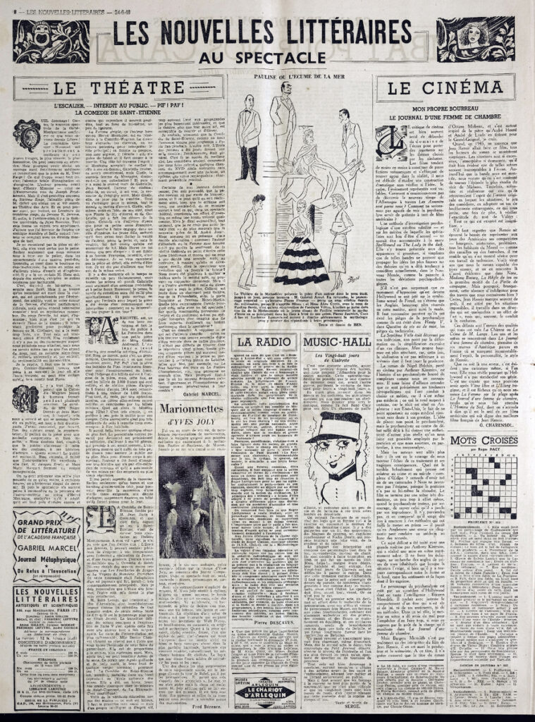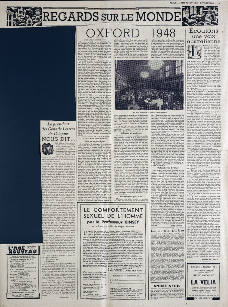 Έντυπο, στα γαλλικά, χαρτί, 4 φύλλα, 8 σελίδες, όπου δημοσιεύονται άρθρα με τίτλους: Charles Plisnier “Le poète est un homme libre”, “Le monde des livres”, Jean Quéval “Oxford 1948”, Gabriel Marcel “L’ escalier-Interdit au public- pif 1 paf 1-la comédie de Saint-Ettienne”, Fred Bérence “Marionnettes d’ Yves Joly”, G. Charensol “Le Cinéma”.