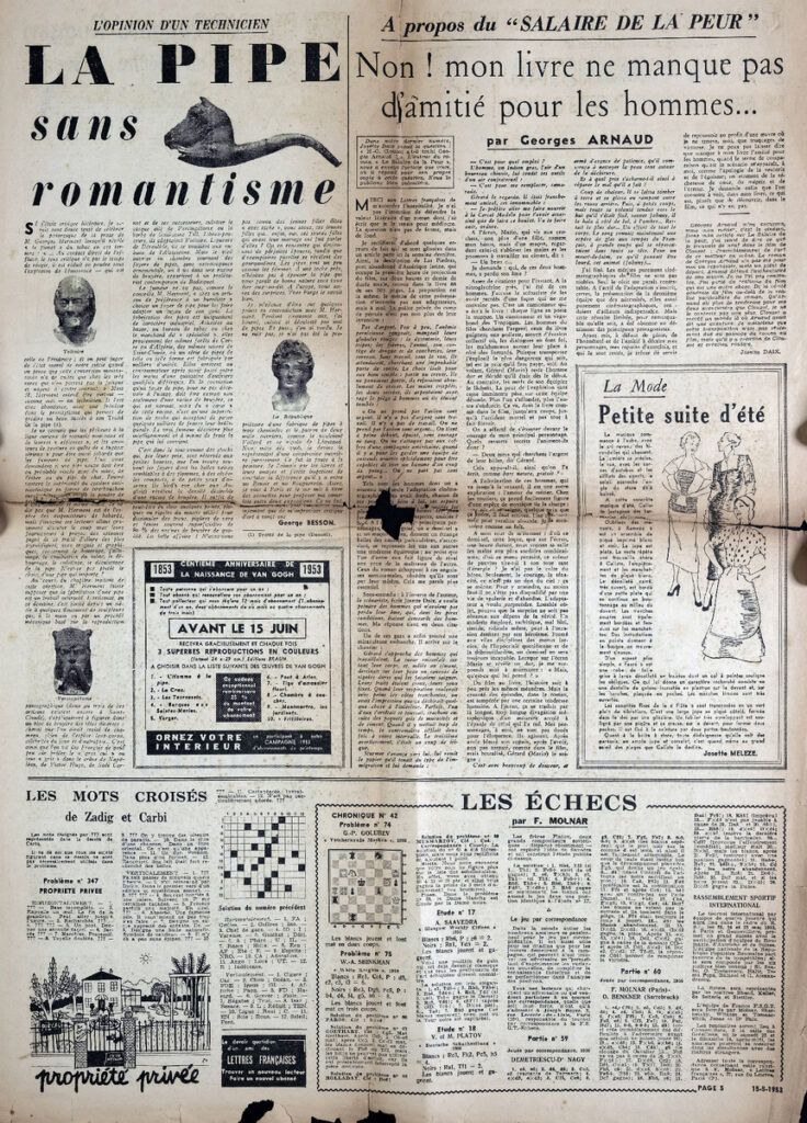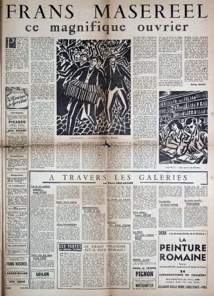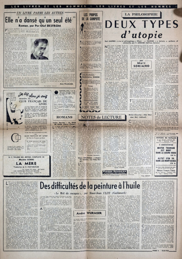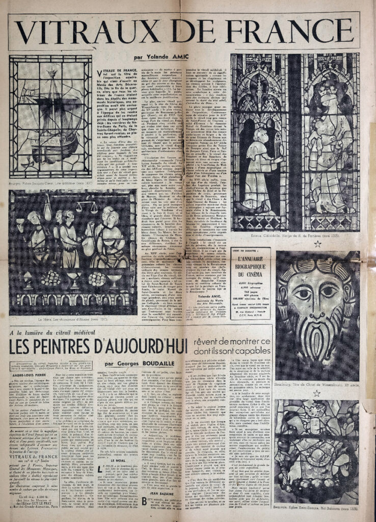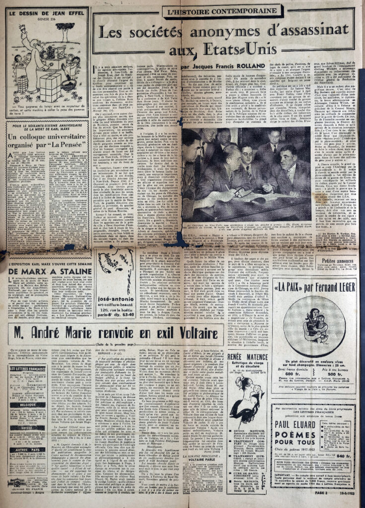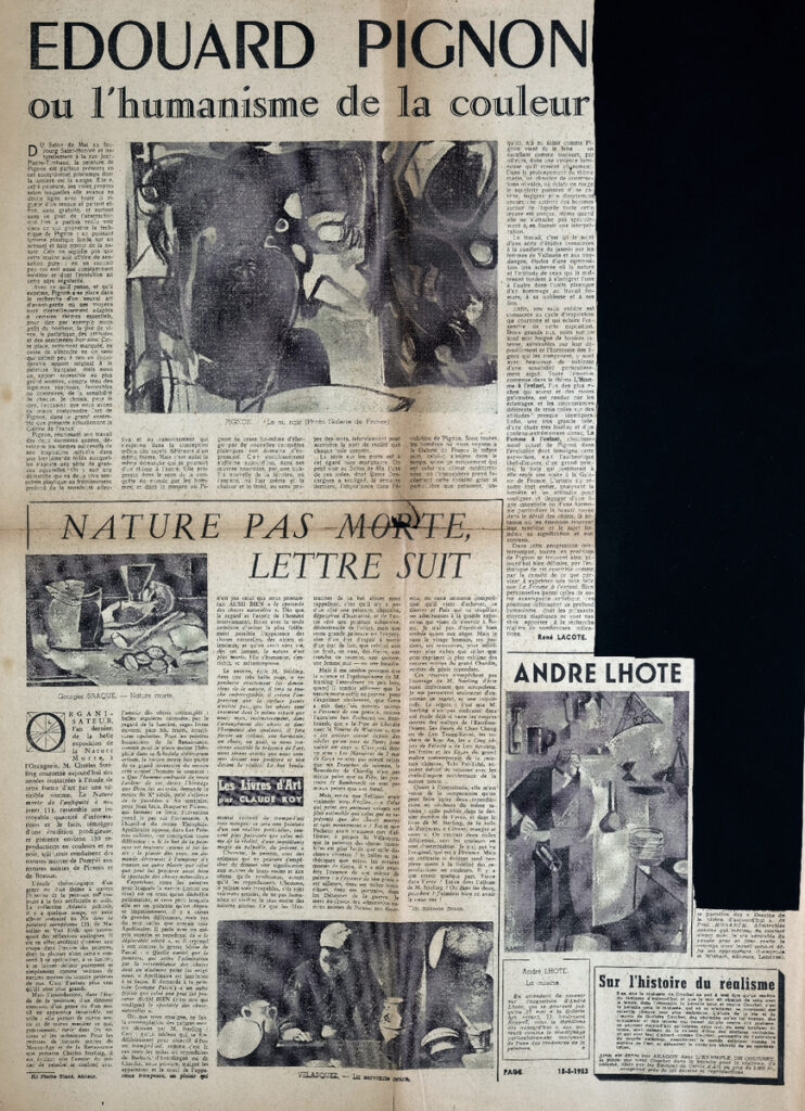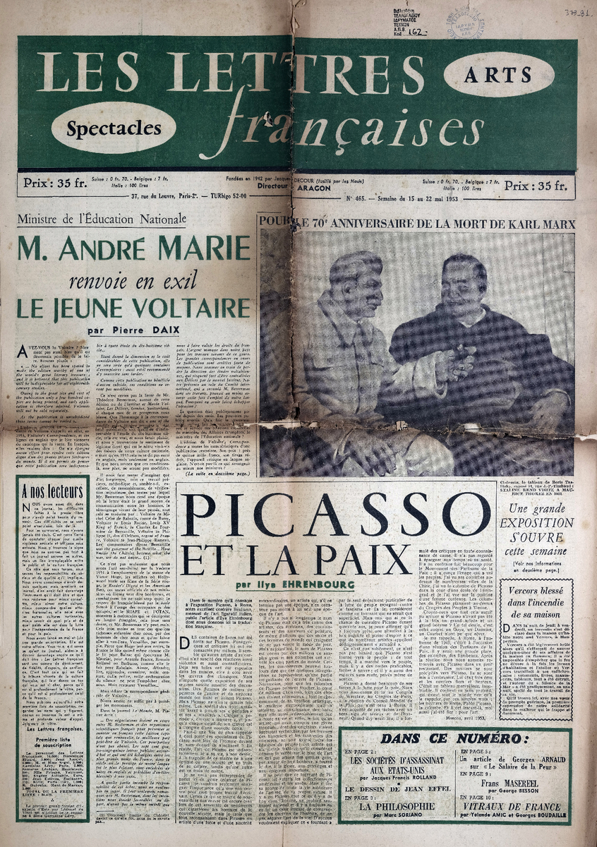 Απόκομμα, έντυπο, στα γαλλικά, χαρτί, 5 φύλλα, 10 σελίδες, όπου δημοσιεύονται άρθρα με τίτλους: Pierre Daix “M. André Marie renvoie en exil. Le jeune Voltaire”, Ilya Ehrenbourg “Picasso et la paix”, George Besson “La pipe sans romantisme”, Georges Arnaud “Non! mon livre ne manque pas d’ amitié pour les hommes…” , André Wurmser “Des difficultés de la peinture à l’ huile”, Rene Lacote “Edouard Pignon ou l’ humanisme de la couleur”, Claude Roy “Nature pas morte lettre suit”, Yolande Amic “Vitraux de France”.