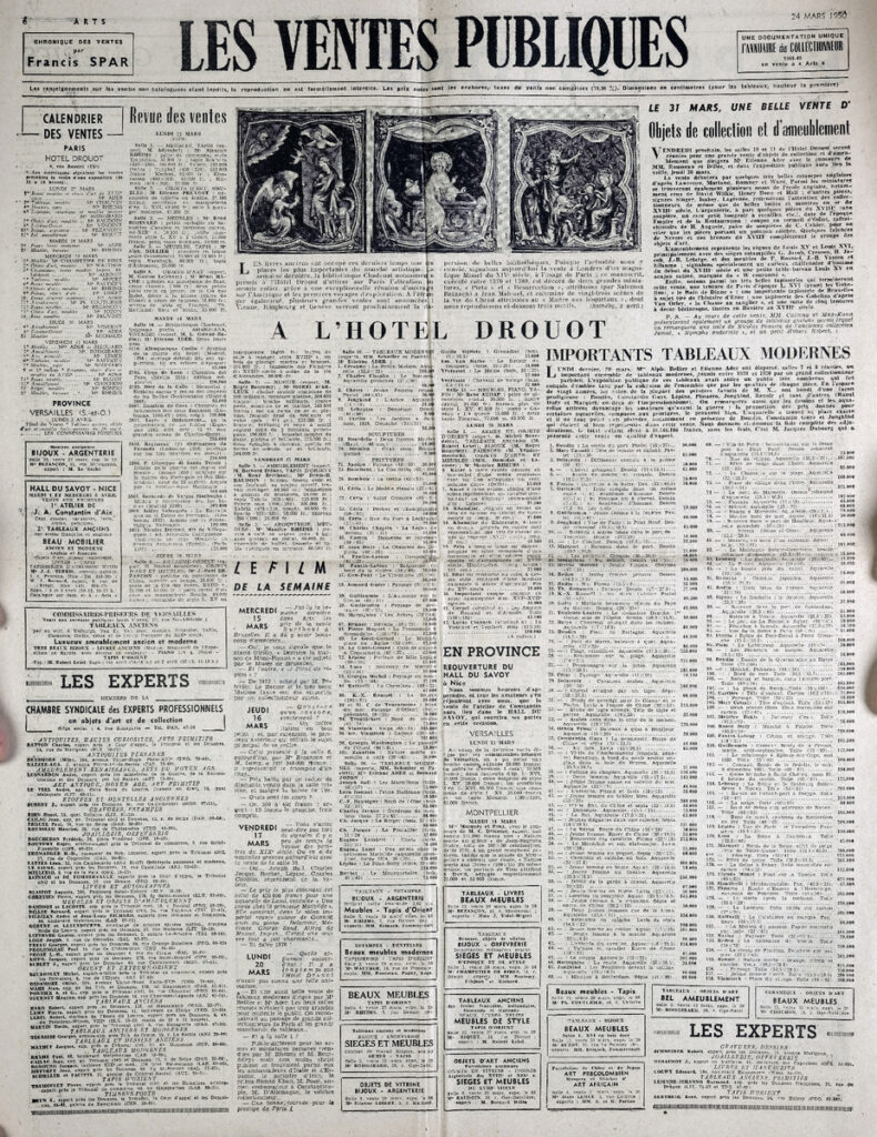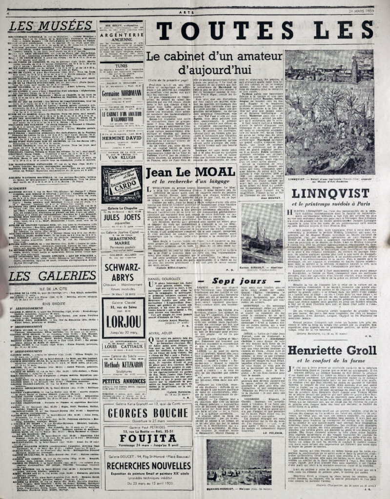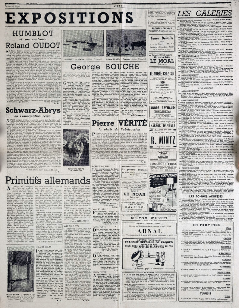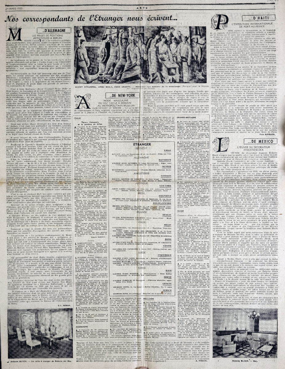 Απόκομμα, έντυπο, στα γαλλικά, χαρτί, 2 φύλλα, 4 σελίδες, όπου δημοσιεύονται άρθρα με τίτλους: J. L. Sebba “Les prises de positions artistiques à Berlin”, “Monde masculine du XIV e s. à demain au metropolitain museum”, Yves Sjoberg “L’ exposition internationale de port au prince”, “L’ oeuvre du decorateur Roberto Block”, “Toutes les expositions”.