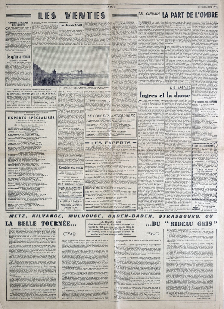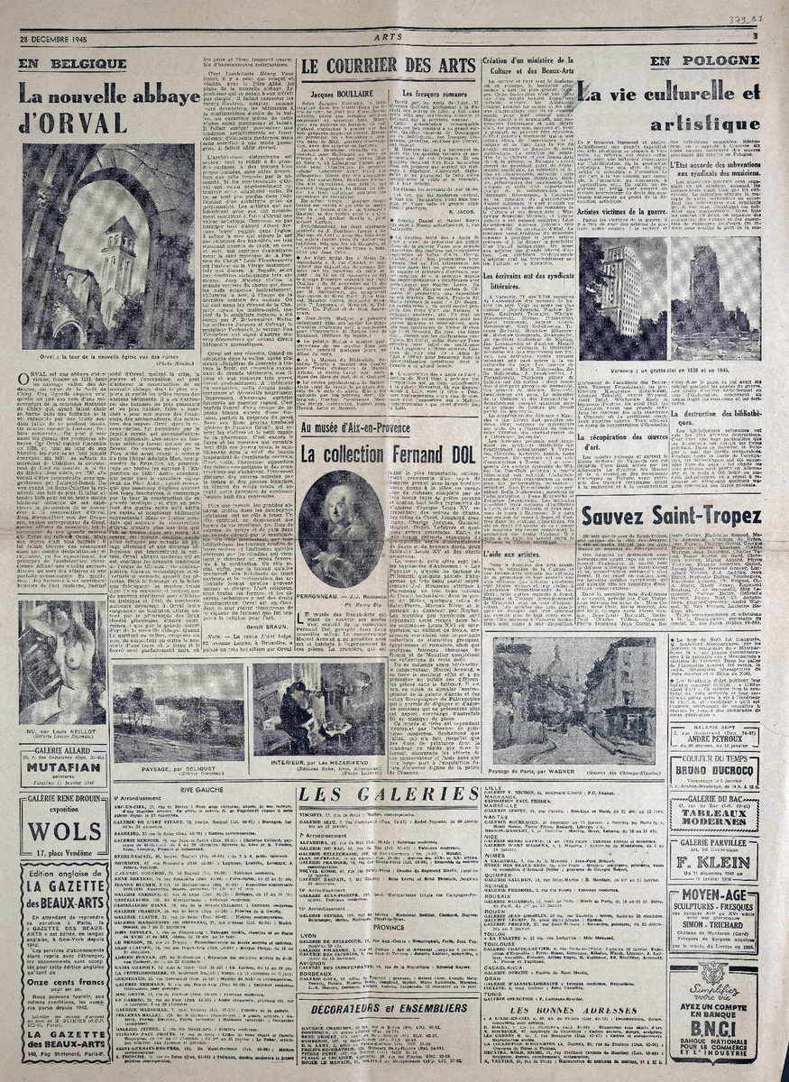 Απόκομμα, έντυπο, στα γαλλικά, χαρτί, 1 φύλλο, 2 σελίδες, όπου δημοσιεύονται άρθρα με τίτλους: Benoit Braun “La nouvelle abbaye d’ Orval”, “Le Courrier des Arts”, “La collection Fernand Dol”, “La vie culturelle et artistique”, “Sauvez Saint-Tropez”, “Francis Spar”, “Les Ventes”.