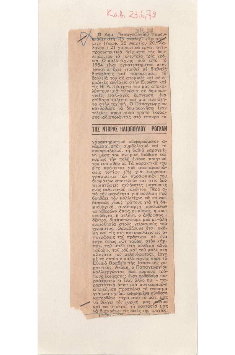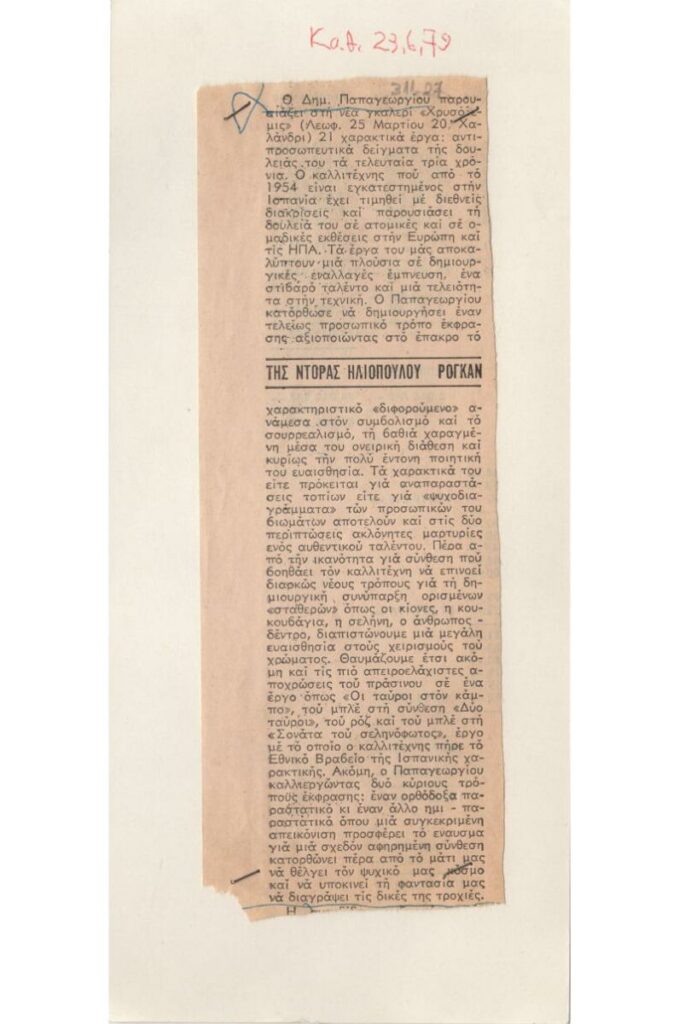 Απόκομμα εφημερίδας, στα ελληνικά, χαρτί, 18×6,5 εκ. Κριτική της Ντόρας Ηλιοπούλου-Ρόγκαν για την ατομική έκθεση χαρακτικής του Δημήτρη Παπαγεωργίου στην Αθήνα.