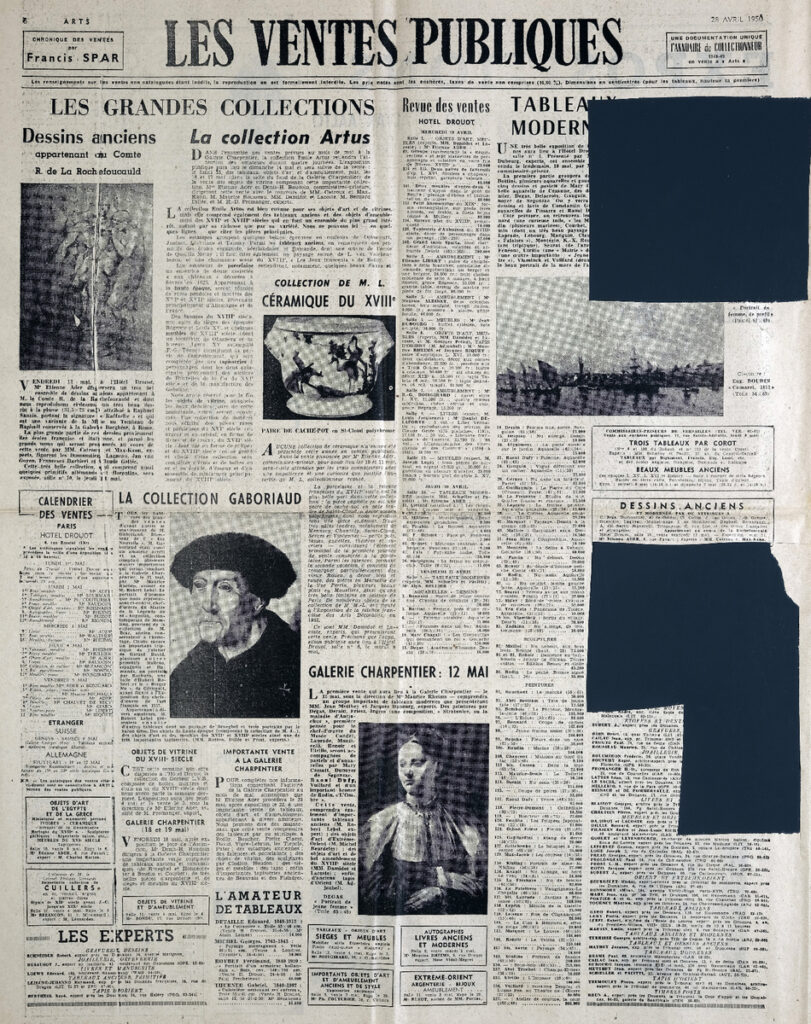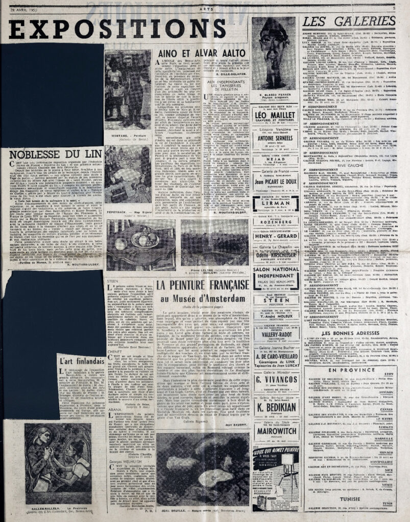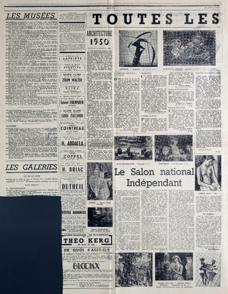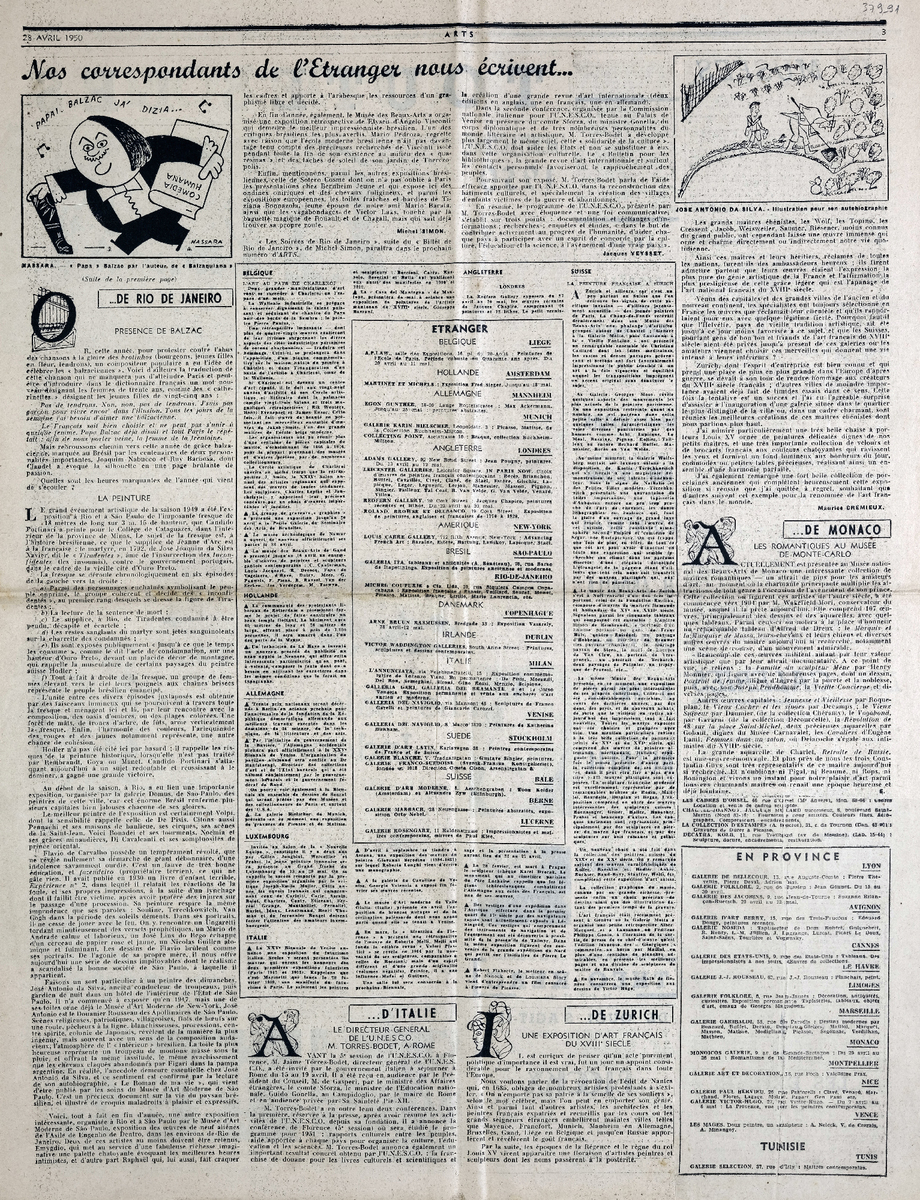 Απόκομμα, έντυπο, στα γαλλικά, χαρτί, 2 φύλλα, 4 σελίδες, όπου δημοσιεύονται άρθρα με τίτλους: Michel Simon “Présence de Balzac”, E. “Les romantiques au Musée de Monte-Carlo”, “Le directeur général de l’ UNESCO M. Torres-Bodet à Rome”, “Une exposition d’ art français du XVIIIe siècle”, Jean Bouret “Le Salon national Indépendant”, Jean Baudry “La peinture française au Musée d’ Amsterdam”.