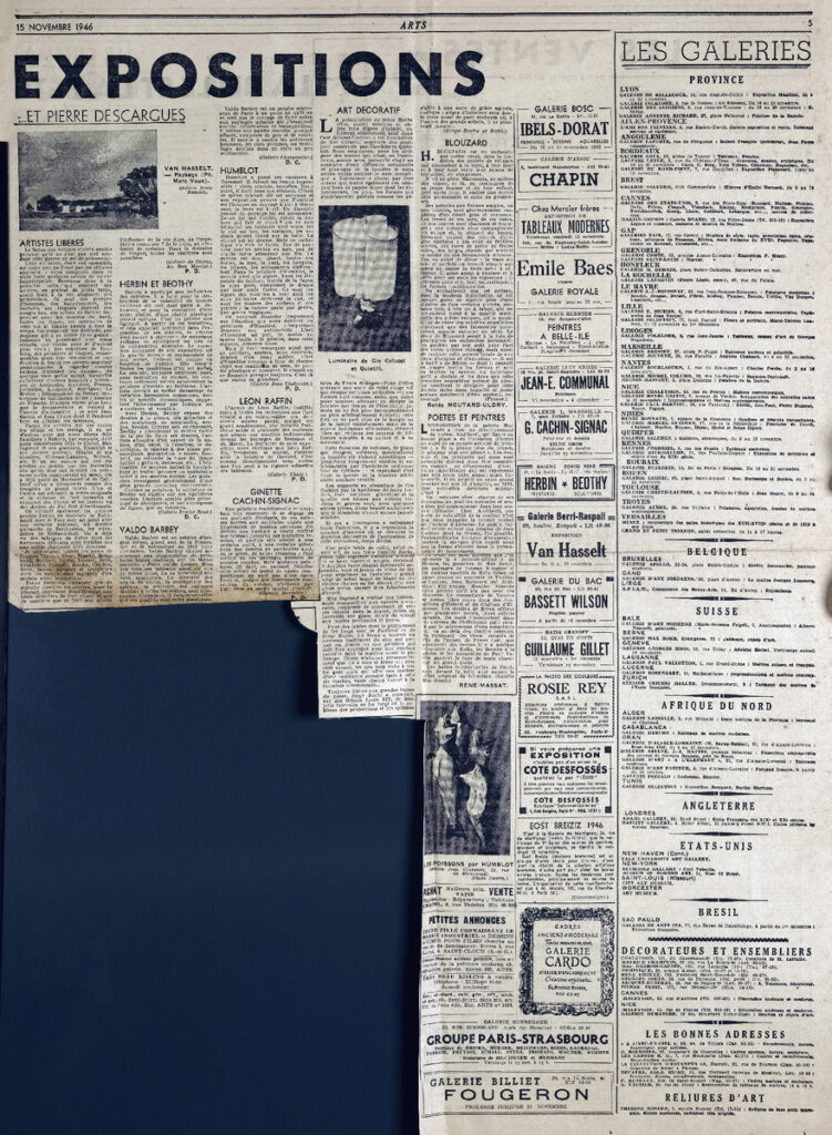 Απόκομμα του περιοδικού “Arts”, έντυπο, στα γαλλικά, χαρτί, δύο φύλλα διπλής όψης. Στο ίδιο απόκομμα: Sidoine “Pour et…contre”, “Toutes les expositions”.