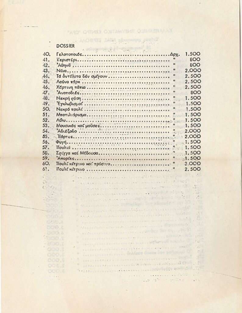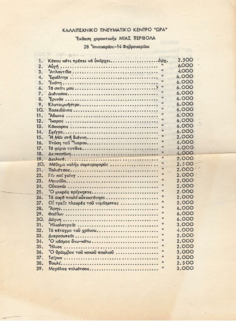 Κείμενο, δακτυλόγραφο, στα ελληνικά, χαρτί, 29,5×21 εκ., μία όψη. Τιμοκατάλογος έργων της ατομικής έκθεσης χαρακτικής της Μίας Περιβόλα στην Αθήνα.