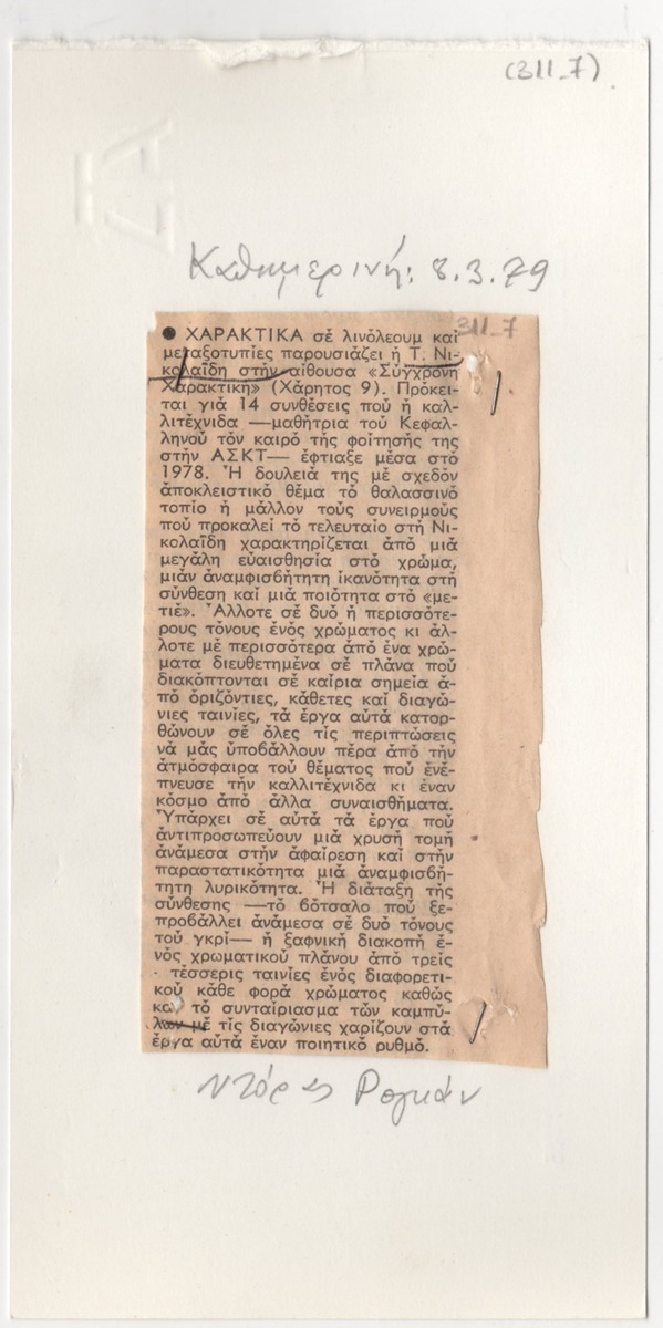 Απόκομμα εφημερίδας (08/03/1979), όπου δημοσιεύεται κριτική για την ατομική έκθεση της Τόνιας Νικολαΐδη στην Αίθουσα «Σύγχρονη Χαρακτική» στην Αθήνα.