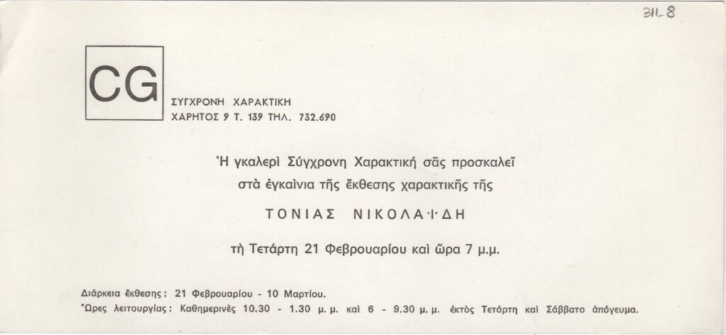 Πρόσκληση εγκαινίων της ατομικής έκθεσης χαρακτικής της Τόνιαε Νικολαϊδη στην γκαλερί «Σύγχρονη Χαρακτική» στην Αθήνα. Στη μία όψη, αναπαραγωγή έργου, α/μ