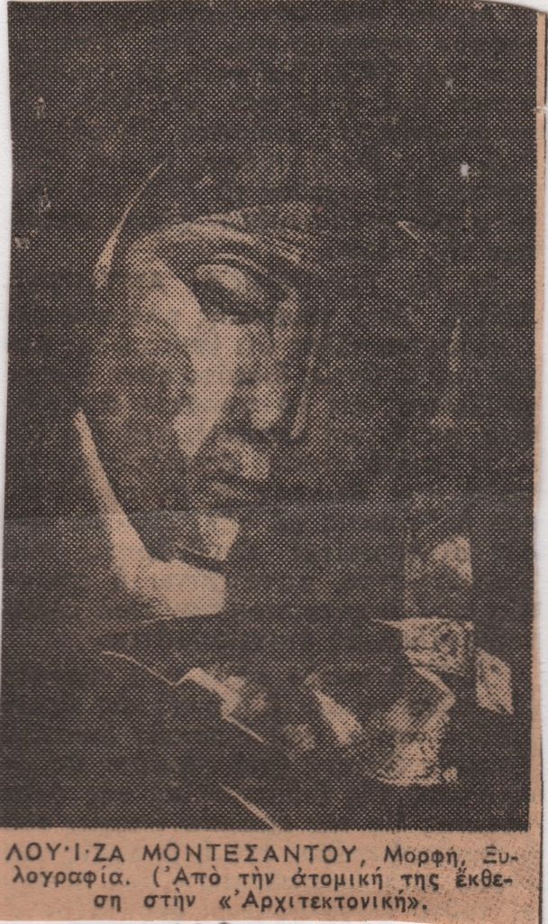Αποκόμματα εφημερίδας, στα ελληνικά, δύο τμήματα: 8×5 εκ. και 18×5 εκ. (το 2ο συραμμένο σε απόκομμα εντύπου από χαρτόνι). Κριτική της ατομικής έκθεσης της Λουίζας Μοντεσάντου και της πρώτης ατομικής έκθεσης του Κίμωνα Συνέσιου στην Αθήνα. Εικονογραφείται με φωτογραφία του έργου της Λ. Μοντεσάντου “Μορφή”. Στο χαρτόνι, επιγραφή.
