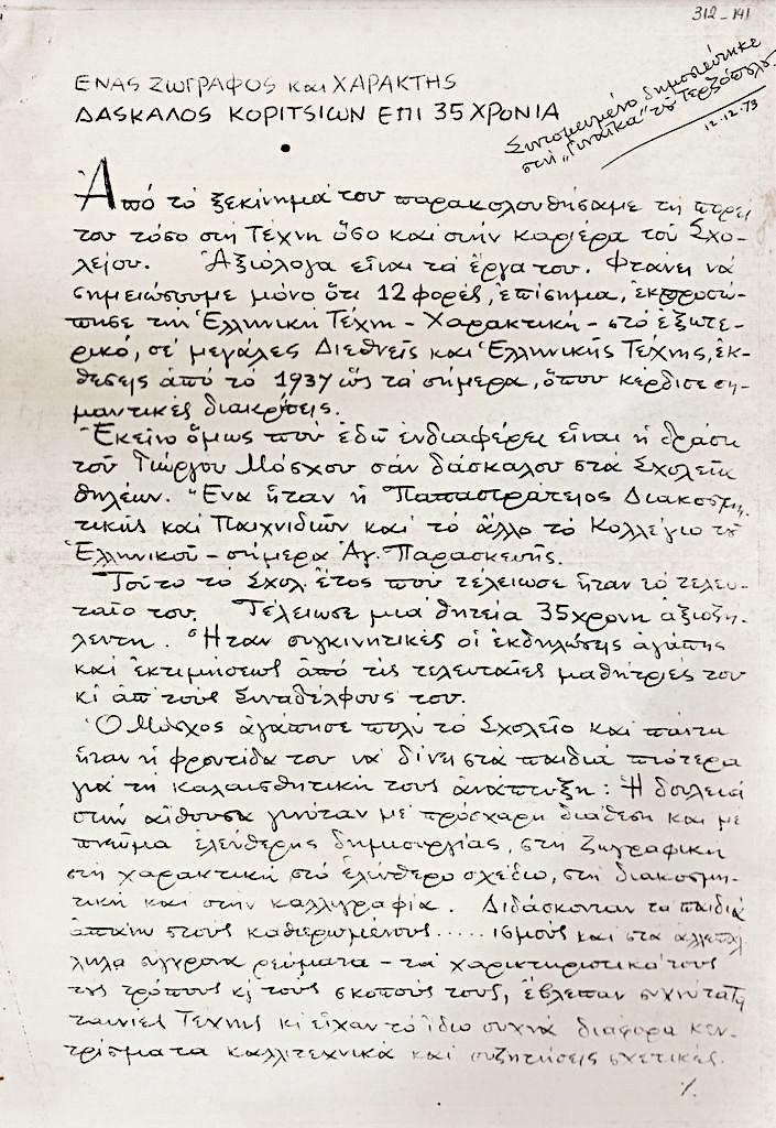 Φωτοαντίγραφο κειμένου, χειρόγραφο, 2 φύλλα, χαρτί, 29,5×21 εκ. Δοκίμιο άρθρου για τον χαράκτη Γεώργιος Μόσχο με ημερομηνία “Ιούλιος 1973”, που δημοσιεύτηκε συντομευμένο στο περιοδικό “Γυναίκα” την ίδια χρονιά. Εικονογραφείται με φωτογραφία έργου του καλλιτέχνη.