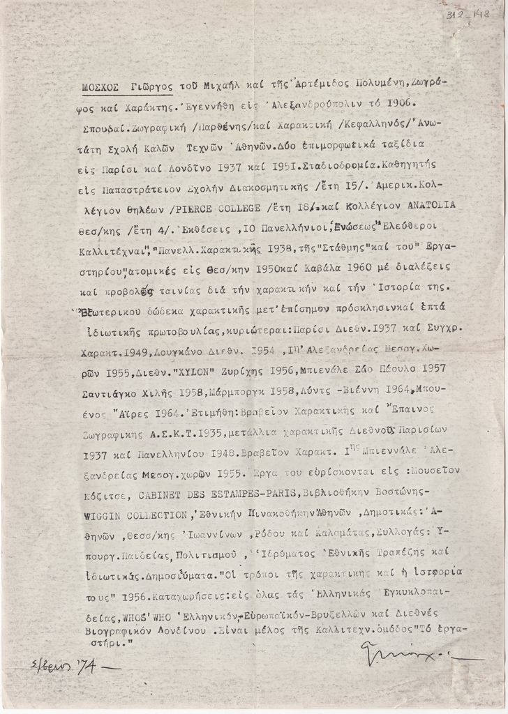 Κείμενο, δακτυλόγραφο, στα ελληνικά, χαρτί, μία όψη, 30×21 εκ. Αναφέρονται σπουδές, επαγγελματική εμπειρία, ομαδικές και ατομικές εκθέσεις, διακρίσεις και βιβλιογραφία. Στο κάτω μέρος της σελίδας, ιδιόγραφη χρονολογία (Σεπτέμβριος 1974) και υπογραφή.