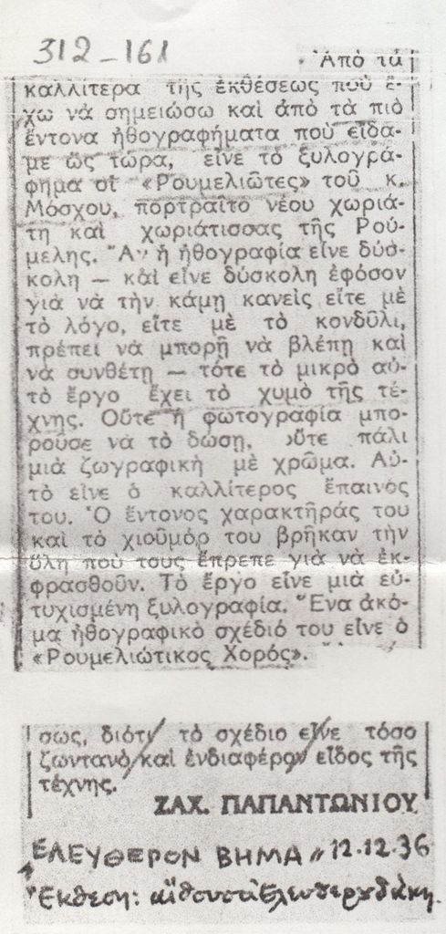 Φωτοαντίγραφο αποκόμματος εφημερίδας, χαρτί, 11×5,5 εκ. Κριτική της παρουσίας του καλλιτέχνη σε έκθεση σχεδίου τριών καλλιτεχνών στην Αθήνα.