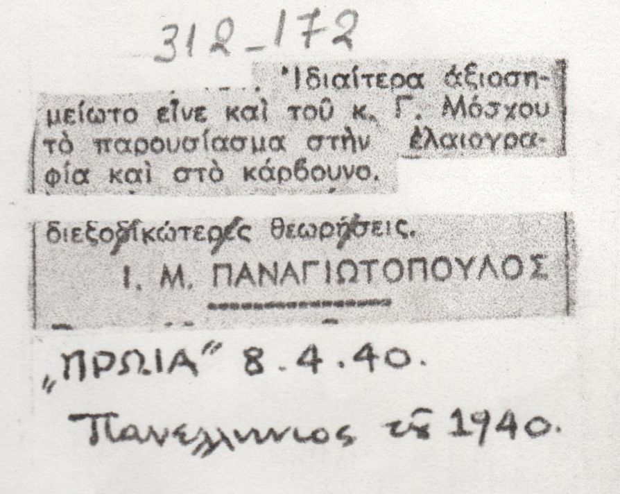Φωτοαντίγραφο αποκόμματος εφημερίδας, χαρτί, 3×5 εκ. Κριτική της παρουσίας του καλλιτέχνη στην Πανελλήνιο Καλλιτεχνική Έκθεση του 1940.