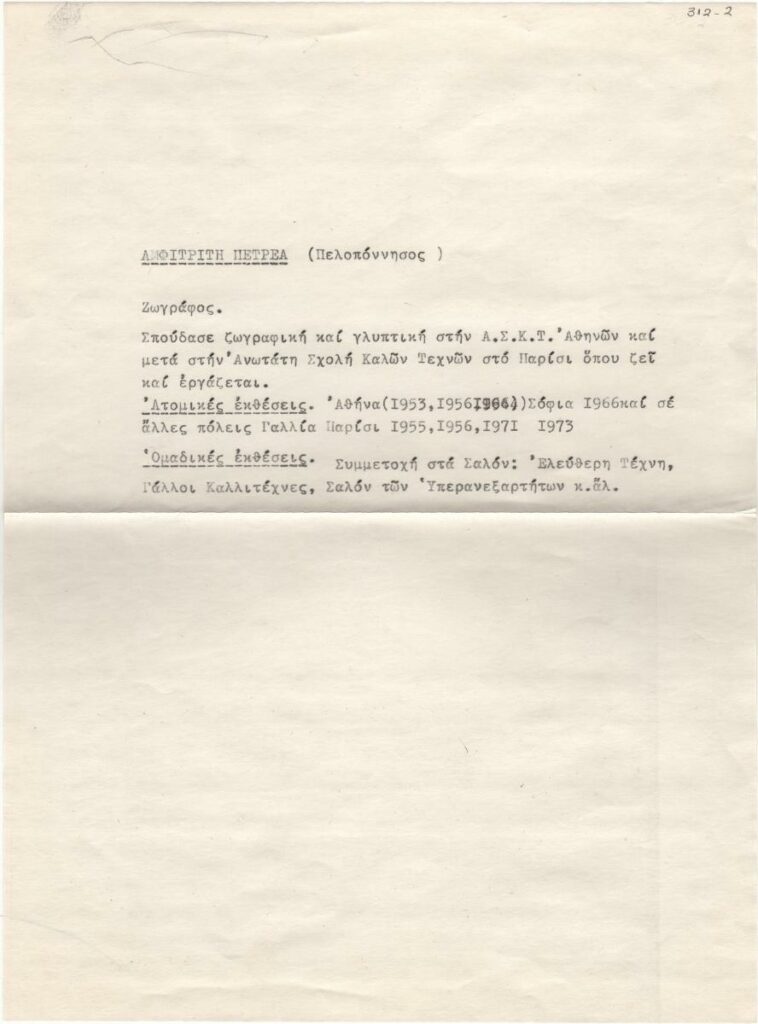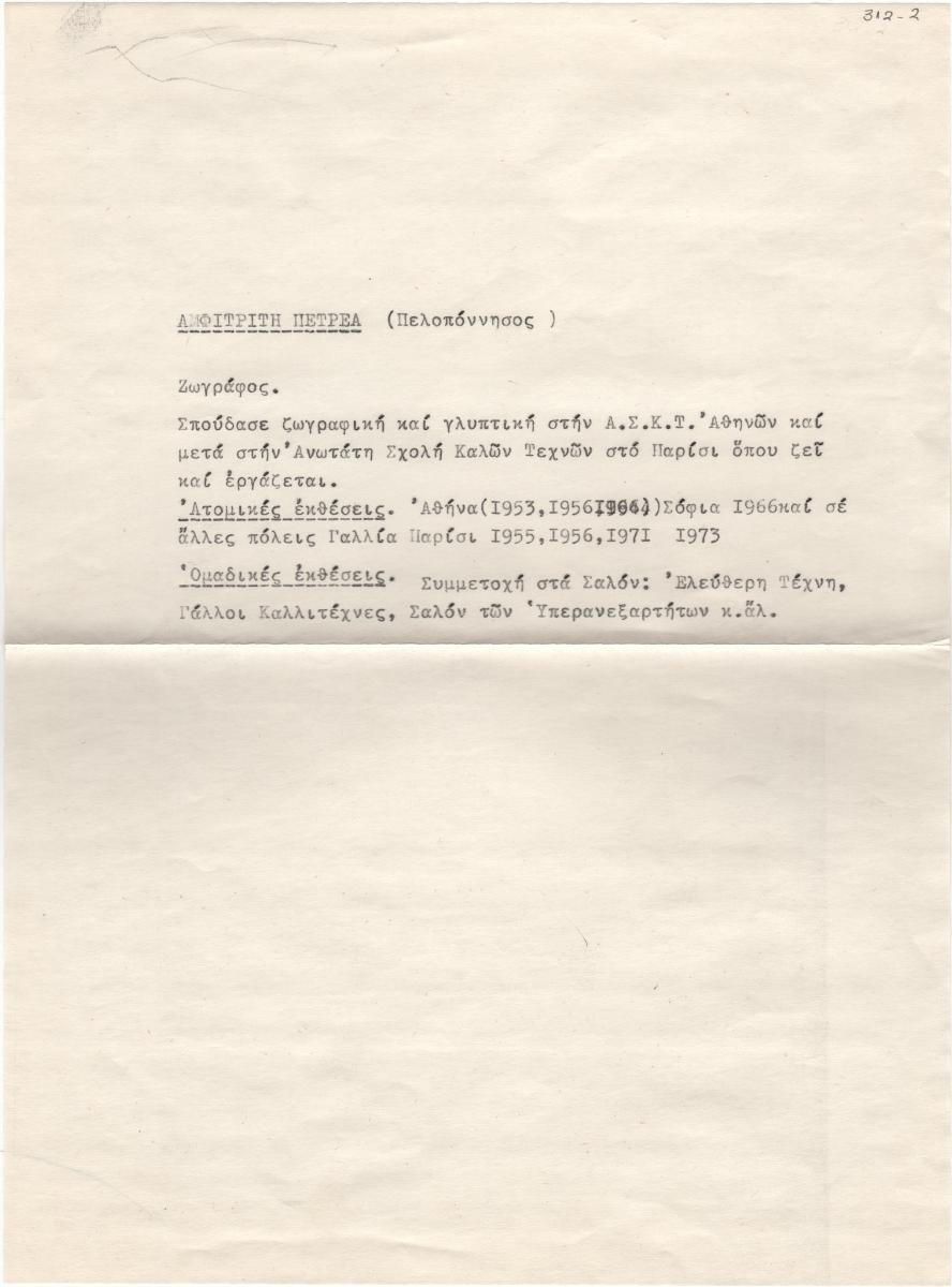Στοιχεία βιογραφικού της Αμφιτρίτης Πετρέα. Αναφέρονται σπουδές, ατομικές και ομαδικές εκθέσεις.