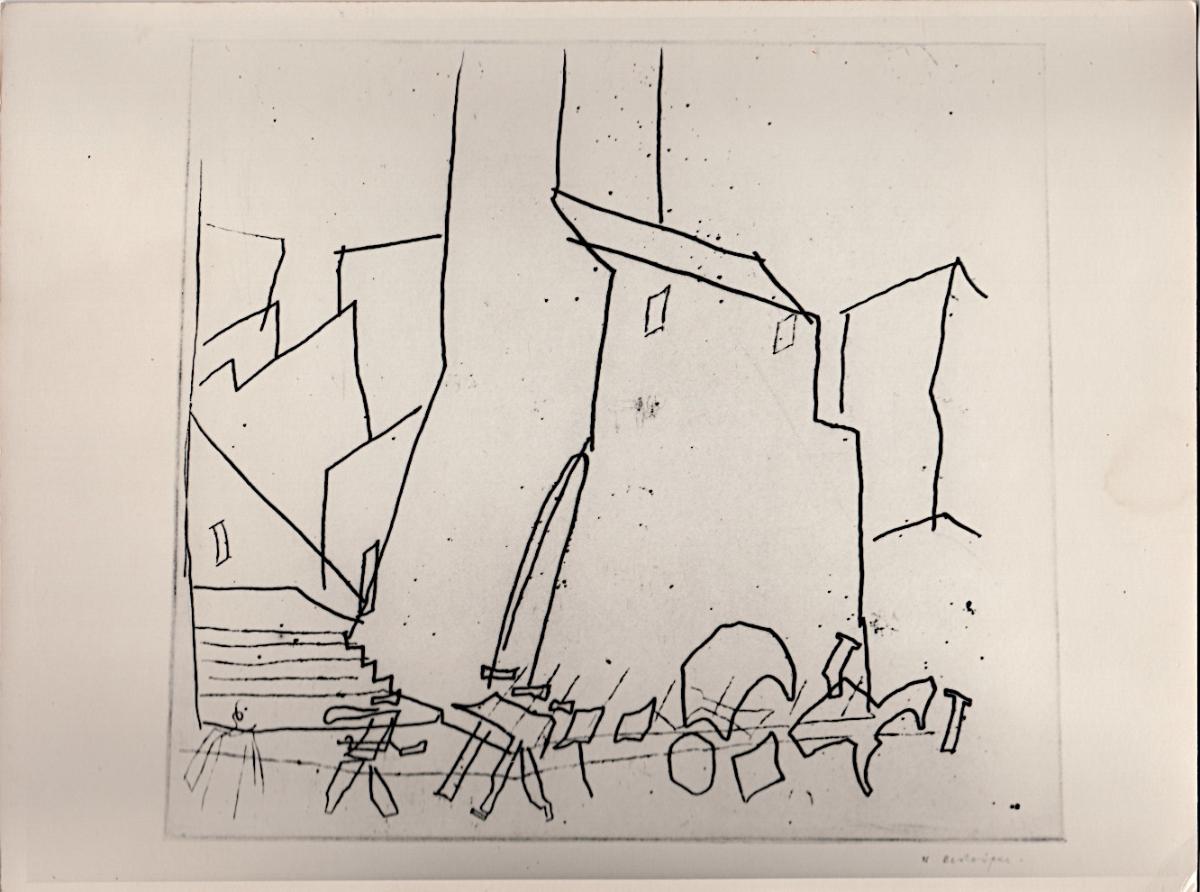 Εκτυπωμένη ασπρόμαυρη φωτογραφία έργου του χαράκτη Νικόλαου Βεντούρα.