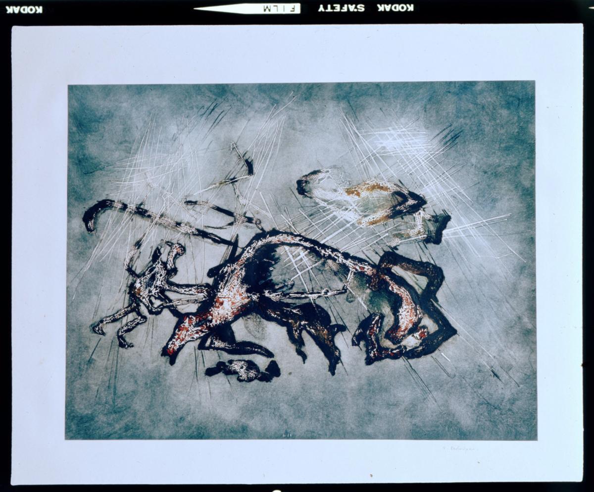 Έγχρωμη φωτογραφία έργου του χαράκτη εκτυπωμένη σε θετικό φιλμ, τοποθετημένο σε θήκη από ριζόχαρτο.