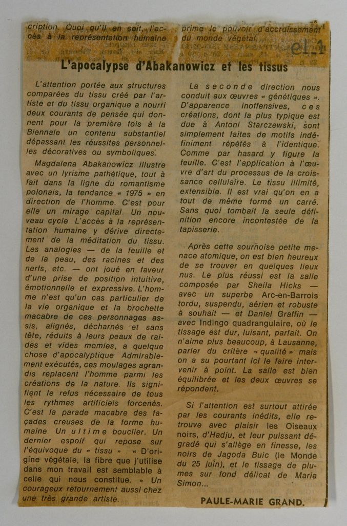 Απόκομμα, έντυπο, χαρτί, 14,8×9,4 εκ., όπου δημοσιεύεται, στα γαλλικά, κριτική της Paule-Marie Grand για την παρουσία της Magdalena Abakanowicz και άλλων καλλιτεχνών στην 6η Biennale Internationale de la Tapisserie στην Λωζάνη [το 1973].