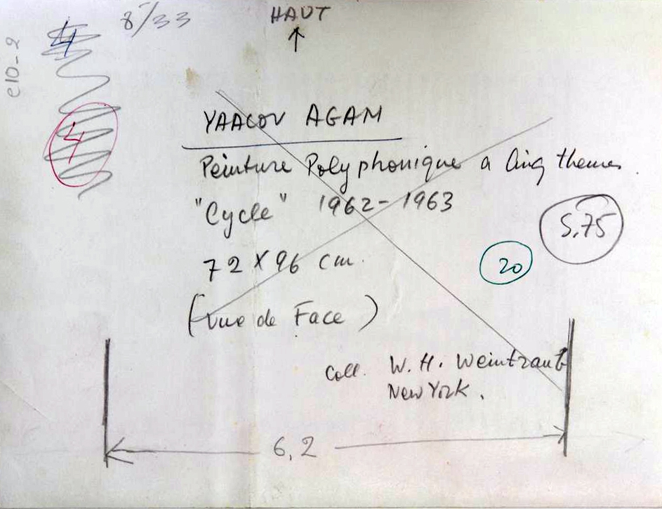Φωτογραφία, α/μ, φωτογραφικό χαρτί, 15,0×19,5 εκ. Αναπαραγωγή του έργου του Yaacov Agam “Peinture Polyphonique à Cinq Themes ‘Cycle’ 1962-1963” Στην πίσω όψη, επιγραφές.