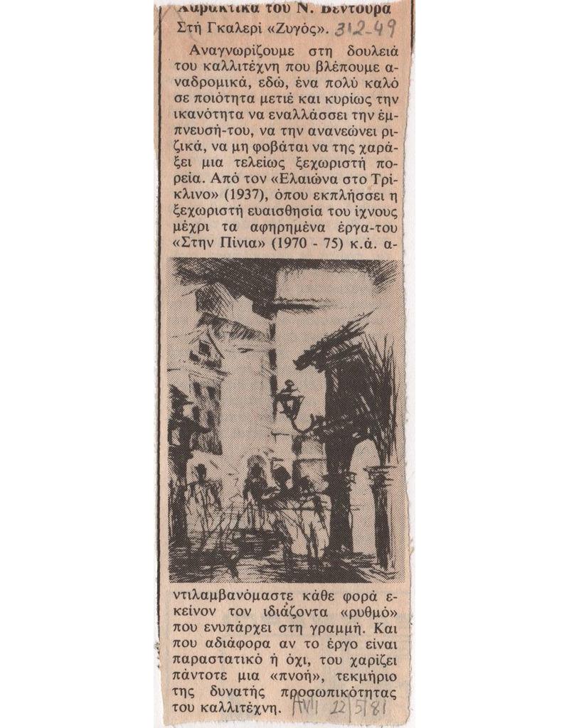 Απόκομμα περιοδικού, χαρτί, 13,5×5 εκ., στα ελληνικά, όπου δημοσιεύεται κριτική ατομικής έκθεσης του Νικόλαου Βεντούρα στην Γκαλερί “Ζυγός” στην Αθήνα. Το απόκομμα είναι επικολλημένο σε φύλλο χαρτί Α4.