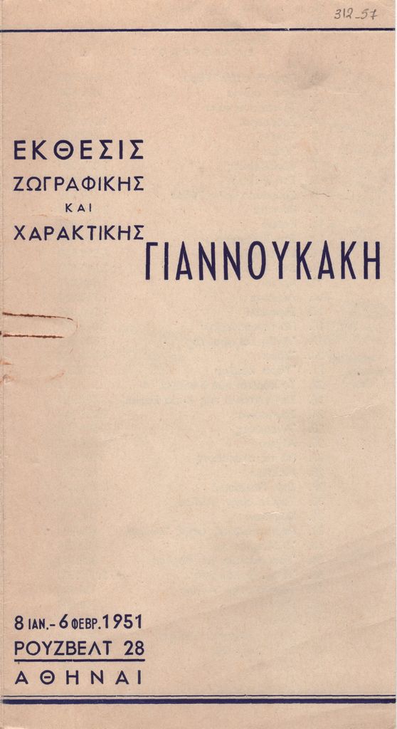 Φυλλάδιο της ατομικής έκθεσης ζωγραφικής και χαρακτικής του Δημήτρη Γιαννουκάκη στην Αθήνα το 1951. Στο εσωτερικό, χειρόγραφες σημειώσεις κριτικής με μολύβι.