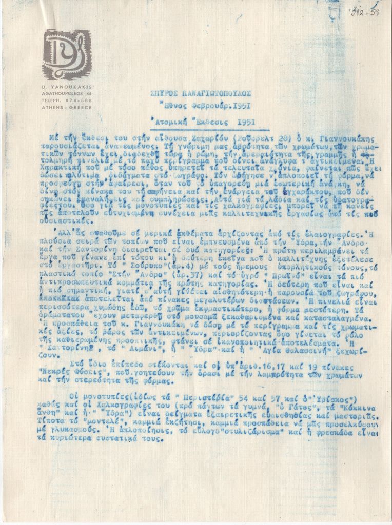Αποδελτίωση κριτικής του Σπύρου Παναγιωτόπουλος για την ατομική έκθεση ζωγραφικής και χαρακτικής του Δ. Γιαννουκάκη στην Αθήνα, που δημοσιεύτηκε στην εφημερίδα “Έθνος” τον Φεβρουάριο του 1951.
