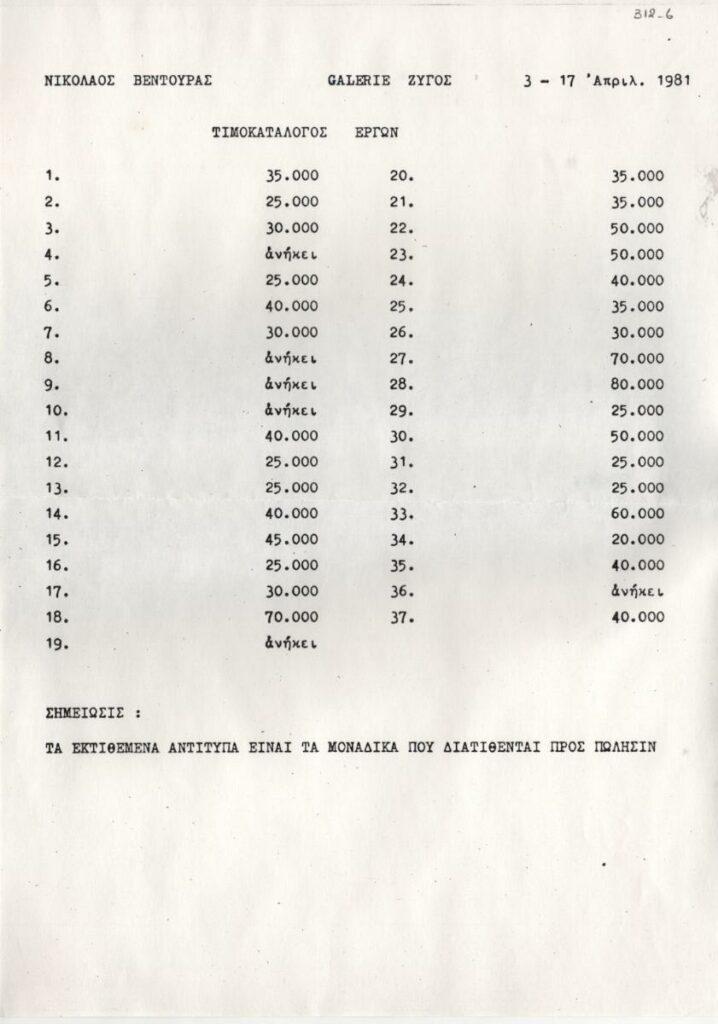 Τιμοκατάλογος έργων έκθεσης, του Νικόλαου Βεντούρα στην Galerie Ζυγός στην Αθήνα το 1981.