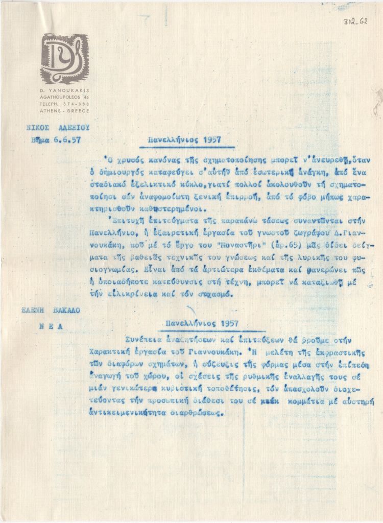 Κείμενο, στα ελληνικά, δακτυλόγραφο, αντίγραφο μπλε καρμπόν, σε χαρτί αλληλογραφίας του Δημήτρη Γιαννουκάκη, 29×21,5 εκ.