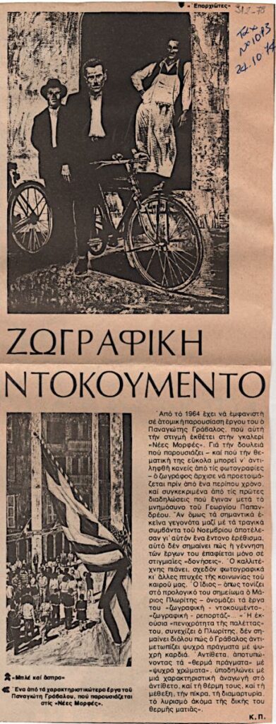 Αποκόμματα περιοδικού, στα ελληνικά, χαρτί, 2 τμήματα: 32,5×12,5 εκ. & 29,5×11,5 εκ. Άρθρο με θέμα την ατομική έκθεση έργων του Παναγιώτη Γράββαλου στην Αθήνα το 1974. Εικονογραφείται με φωτογραφίες των έργων: “Επαρχιώτες”, “Μπλε και άσπρο”. Επιγραφή.