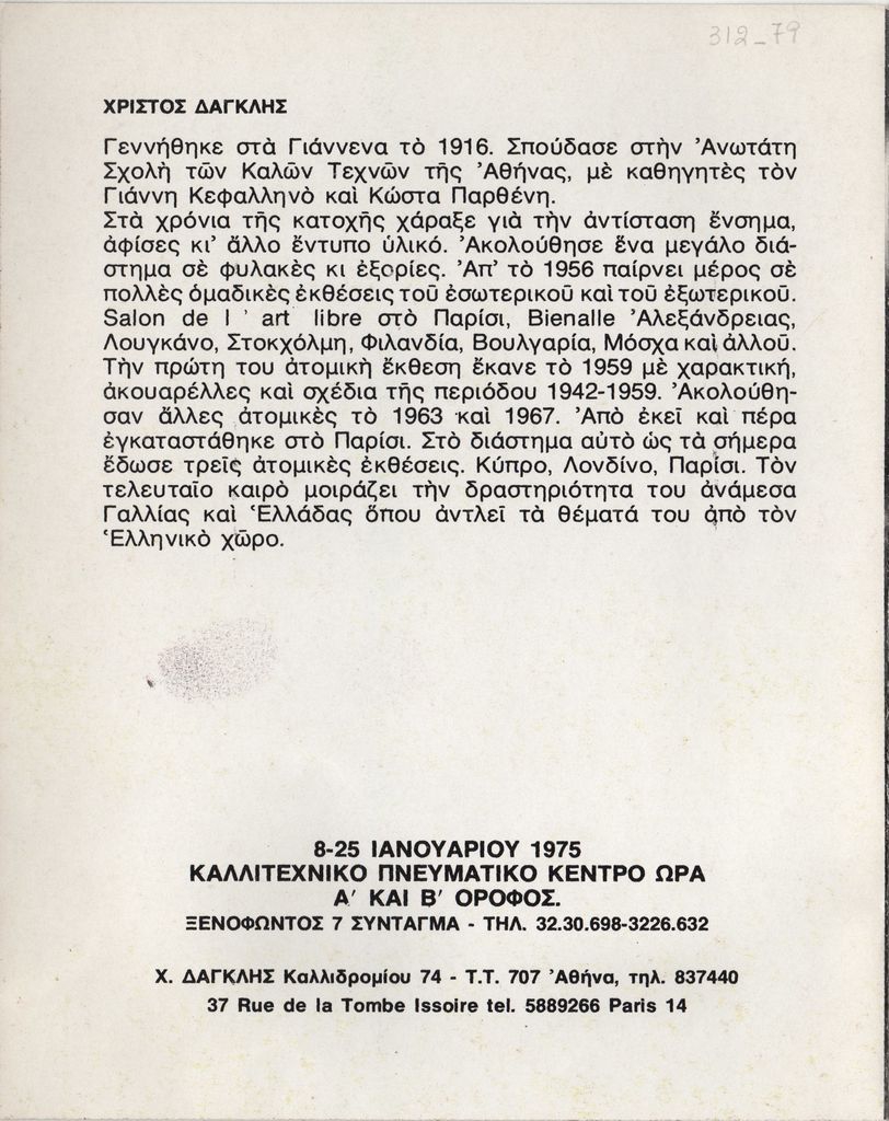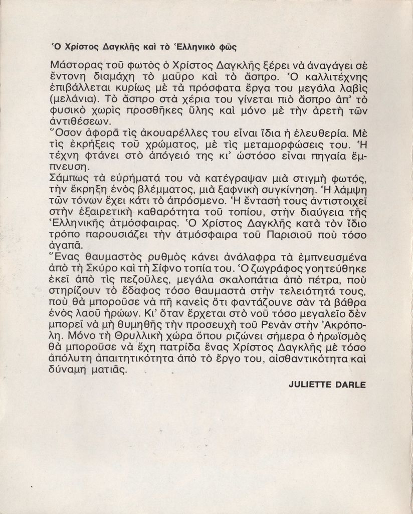 Φυλλάδιο της ατομικής έκθεσης του Χρήστου Δαγκλή στην Αθήνα το 1975. Περιέχει κριτικό σημείωμα της Juliette Darle με τίτλο “Ο Χρίστος Δαγκλής και το Ελληνικό φως” και βιογραφικό καλλιτέχνη. Εικονογραφείται με φωτογραφίες έργων και φωτογραφία του καλλιτέχνη.