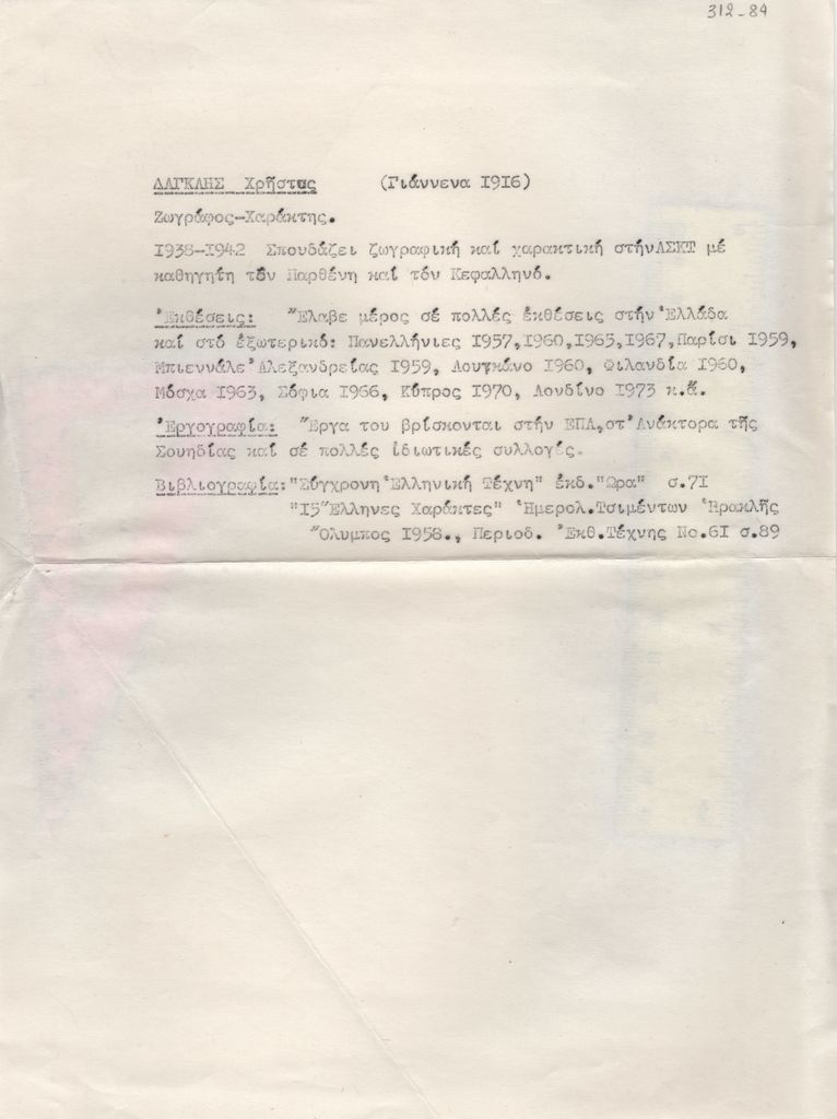 Κείμενο, στα ελληνικά, μία όψη, σε χαρτί, 29×21,5 εκ. Στοιχεία βιογραφικού του ζωγράφου και χαράκτη Χρίστου Δαγκλή. Αναφέρονται: σπουδές, εκθέσεις, εργογραφία και βιβλιογραφία για τον καλλιτέχνη.