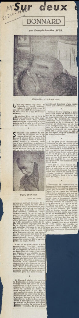 Απόκομμα, χαρτί ακανόνιστου μεγέθους, στα γαλλικά, δημοσίευσης κειμένου αναφερόμενου στο εικαστικό έργο του Pierre Bonnard. Πρόκειται για τμήμα προλόγου καταλόγου έκθεσης ζωγραφικής του καλλιτέχνη, που διεξάγεται στην Galerie Bernheim-Jeunes στο Παρίσι.