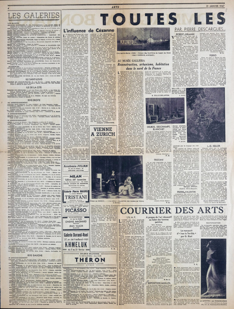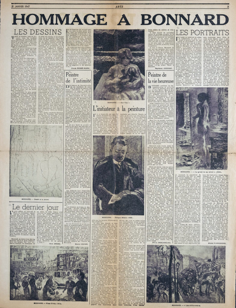 Απόκομμα, χαρτί, 60×43 εκ., στα γαλλικά, δημοσίευσης κειμένου αφιερωμένου στο εικαστικό έργο του Pierre Bonnard. Εντάσσεται σε αφιέρωμα του εντύπου για τον θάνατο του καλλιτέχνη “Hommage à Bonnard”.