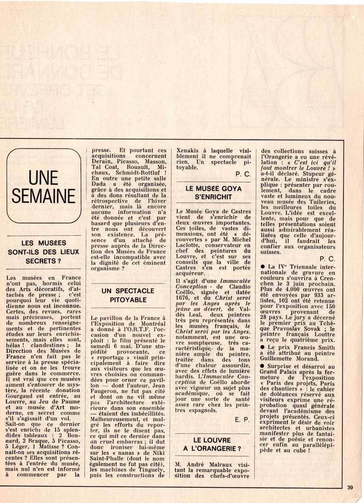 Απόκομμα, χαρτί, 2 φφ, 28×21 εκ., στα γαλλικά, δημοσίευσης στήλης του εντύπου, η οποία αναφέρεται στην καλλιτεχνική κίνηση της περιόδου. Ειδικότερα, άρθρα για τα μουσεία της Γαλλίας, για Καναδική έκθεση, για το Μουσείο Goya και για τις συλλογές του Λούβρου καθώς και για την 4η Triennale χαρακτικής και για έκθεση στο Grand Palais.