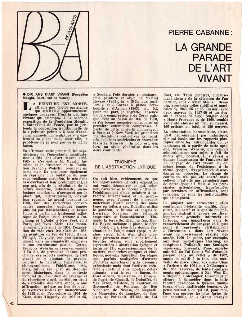 Απόκομμα, χαρτί, 28×21 εκ., στα γαλλικά, δημοσίευσης κριτικής έκθεσης με τίτλο “Dix ans d’ art Vivant”, η οποία διεξάγεται στην Fondation Maeght στο Παρίσι.