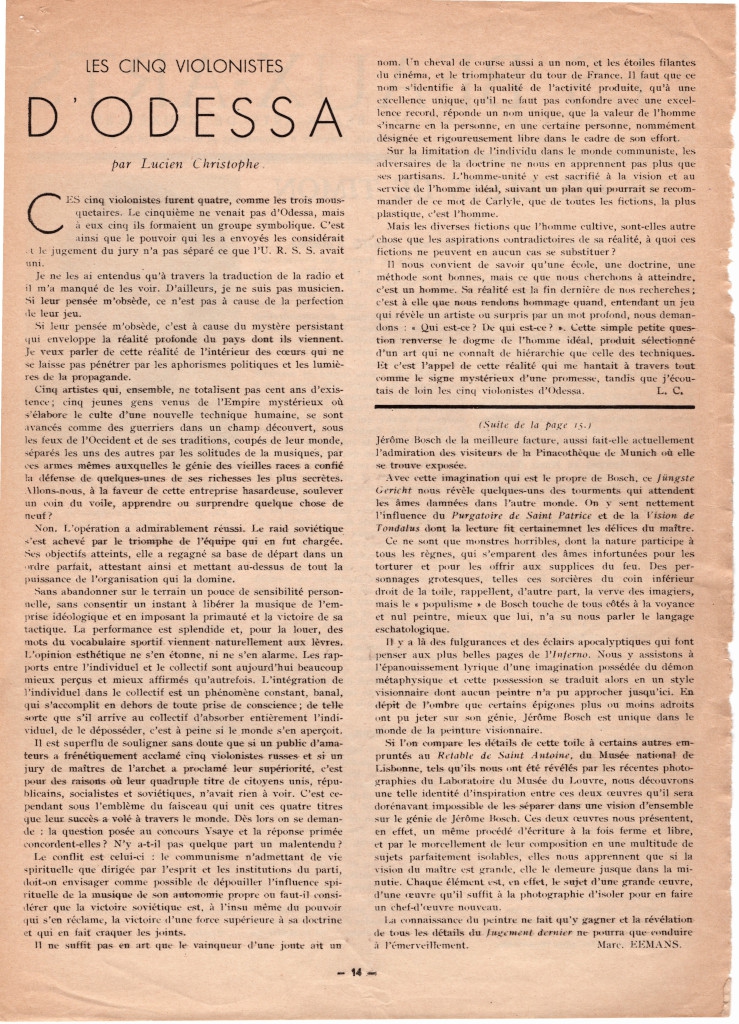 Απόκομμα, έντυπο, χαρτί, 2 φφ., 30,4×21,7 εκ., όπου δημοσιεύεται, στα γαλλικά, κριτική του βέλγου ποιητή Lucien Christophe για τη συναυλία μουσικού συνόλου βιολιστών από την Οδησό στις Βρυξέλλες το 1937. Στις άλλες σελίδες του τεκμηρίου δημοσιεύονται τα άρθρα: J. Weterings “La Vie Musicale” και “Les Feuillets de Timon” και Marc Eemans “Le jugement dernier. Un chef-d’ ouevre inconnu de Jerome Bosch”. Στην πρώτη σελίδα του τεκμηρίου, επιγραφή.
