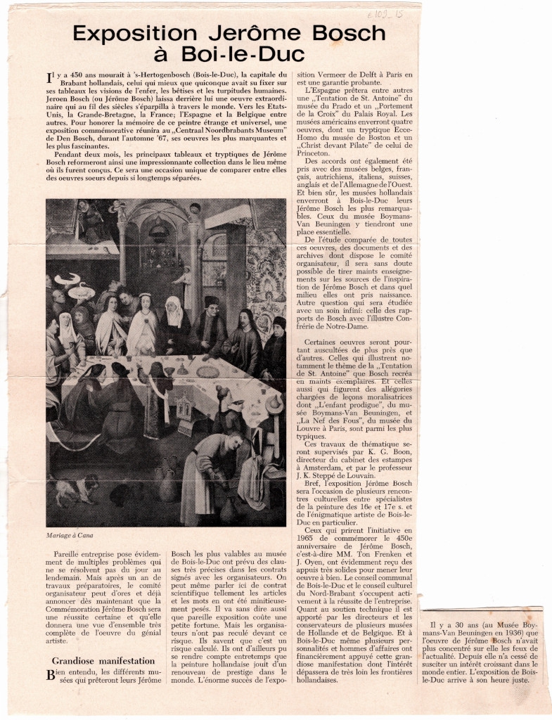 Απόκομμα, έντυπο, χαρτί ιλουστρασιόν, 30,7×23,0 εκ. (ακανόνιστο σχήμα), όπου δημοσιεύεται κριτική, για την μεγάλη έκθεση έργων του Ολλανδού ζωγράφου της Αναγέννησης Ιερώνυμου Μπος στο ‘s-Hertogenbosch (Bois de Luc)